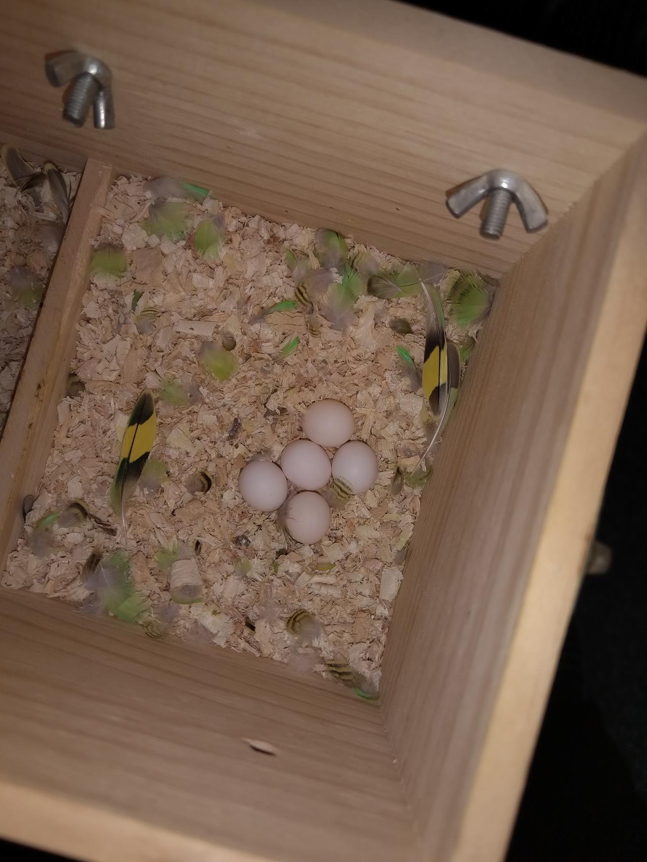 我家养的虎皮鹦鹉下蛋了,期待20天见到鸟宝宝。图一是公鸟,图二是母鸟在抱窝,图三是鸟蛋,可能还会增加一个蛋。