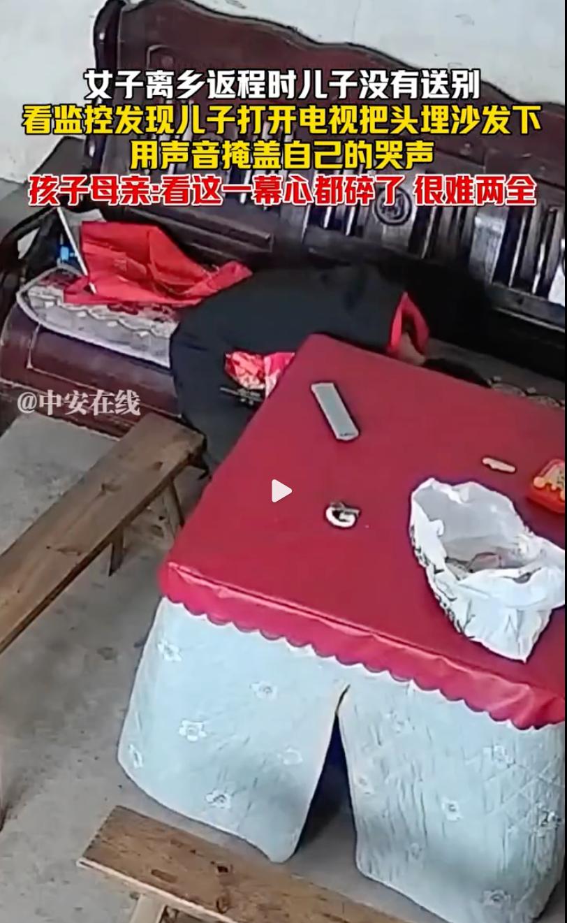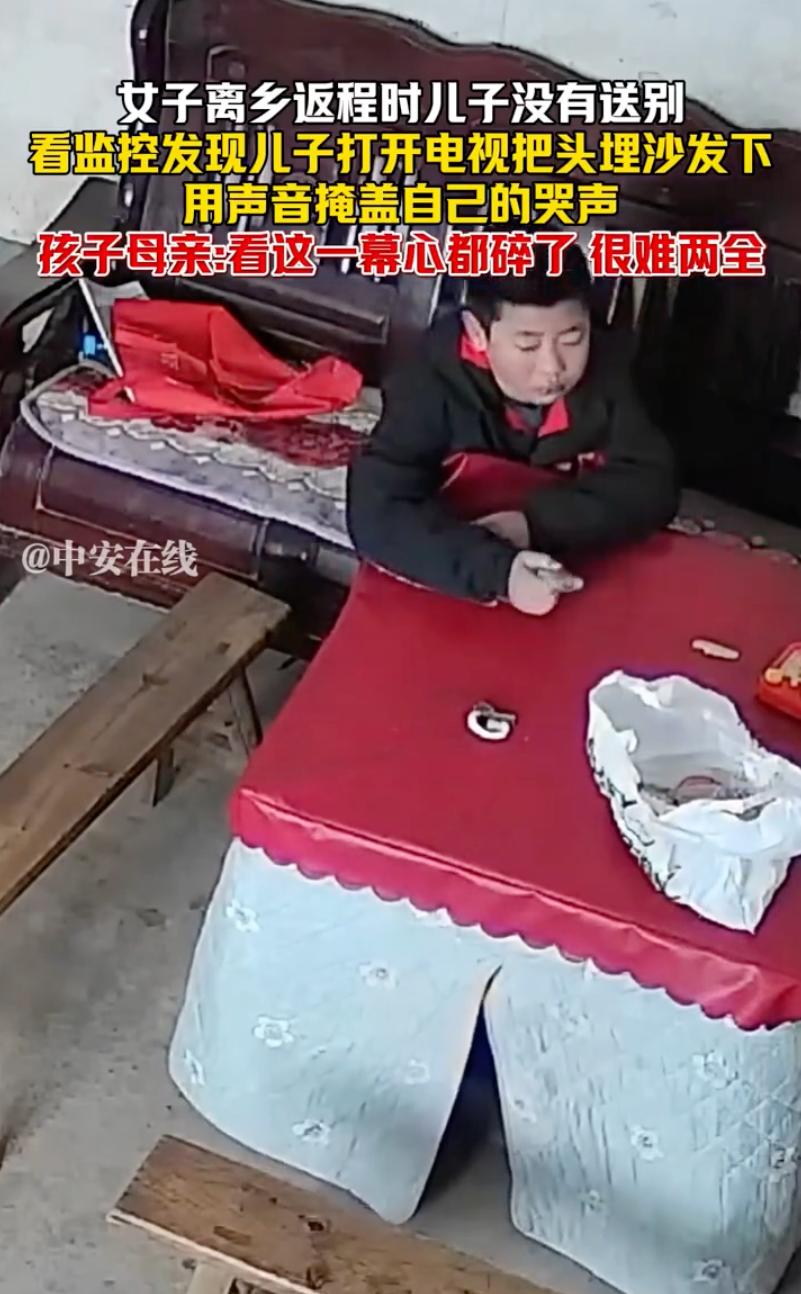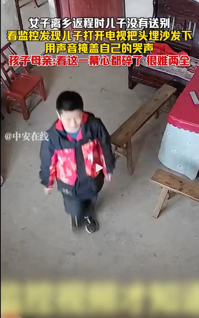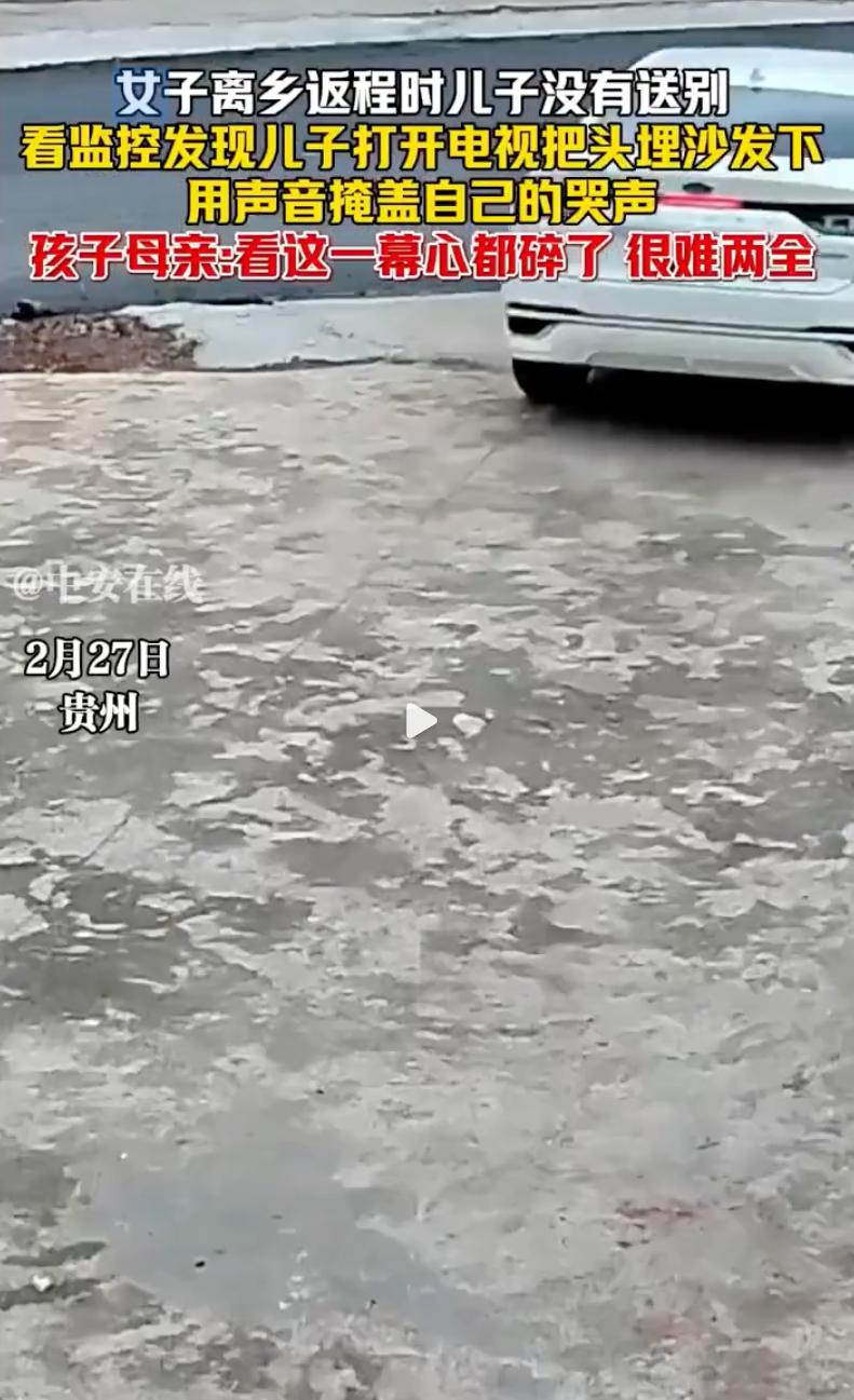看完心酸!贵州一位妈妈节后离家返程,10岁左右的儿子竟然连门都没出送送她,母亲本以为孩子不懂事,谁成想看了一眼家里的监控瞬间泪崩,男孩躲在屋里偷偷抹眼泪,还特意把电视声音开到最大来掩盖哭声。网友看完直呼,这孩子哪是冷漠,他分明是怕自己当场绷不住啊。 2月27号那天,正值假期结束的返程高峰,这位贵州妈妈坐上白色的轿车离开了老家。当时儿子连院子都没出,做母亲的心里多少有点失落,结果等她打开堂屋的监控一看,眼前的画面直接像针一样扎在心上,画面里那个穿着厚外套的10岁小男孩,看着妈妈的车开远,一个人失落地在屋里来回走,后来他独自坐在桌子前,开始抬起手背拼命抹眼泪。 最后情绪彻底崩溃了,他直接抓起桌上的遥控器把电视打开,然后把头深深地埋在手臂里,趴在沙发边上,用电视的嘈杂声死死盖住自己的哭泣声,就生怕让家里的爷爷奶奶听见。 看着这揪心的一幕,评论区直接破防了。 有不少网友留言说,妈妈为了生活到处奔波,孩子为了妈妈被迫懂事,他不出去送行根本不是绝情,而是心里有着最深的爱和理解,实在怕当面送别会哭出声来。 这番话狠狠戳中了不少打工人的软肋,我也是深有同感,以前我出去打工的时候,家里的孩子也是在车屁股后面哭着死命追。 其实仔细琢磨琢磨,留守儿童永远是底层父母心里最痛的那块疤,爷爷奶奶带娃和爸妈亲自带绝对是两码事,现在咱们连扶贫这块硬骨头都啃下来了,社会整体生活水平也上来了,真的是时候该彻底解决一下留守儿童和留守老人的痛点了,大人哪怕克服再多的困难,也得尽量把孩子带在身边亲自培养,错过了孩子的成长期真的是后悔都来不及,千万别再让骨肉长期分离的悲剧重演了。