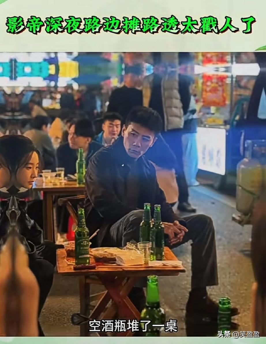 影帝深夜路边摊吃宵夜太戳人! 谁懂啊,影帝深夜路边摊路透,太抽人了,挤在小凳子上,腿都伸不开,空酒瓶堆了一桌,全程沉默,眼神放空,这股子落寞感隔着屏幕都能感受到。