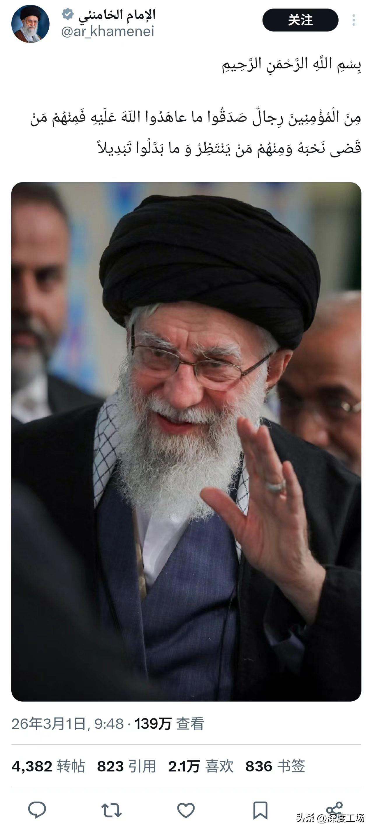 据称是哈梅内伊的社交账号发布了最后一条信息 在信徒们中,有一些人履行了他们的承诺;其中有一些人已经完成了自己的使命,还有一些人仍在等待;他们没有违背自己的誓言或承诺。