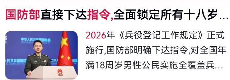 2026兵役登记新规:不办=堵死前途,无例外! 国防部重磅指令已落地,没有例外、不打折扣、终身影响。 从2026年起,年满18周岁男性,未完成兵役登记,将面临系统级硬限制: 高考报名直接拦截,无法提交;大学学籍无法注册,等于白考;公务员、事业单位、国企政审第一关直接淘汰,连门槛都摸不到。 很多家长还在误区里:不当兵就不用登记?大错特错! 兵役登记≠当兵,仅需线上5分钟,选“仅兵役登记”即可,不强制入伍,不影响升学、就业、留学。 覆盖范围:2026年12月31日前满18岁男性,城乡、在校、打工、留学生全覆盖,24岁内漏登必须补登。身体、学历均非不登记理由,可申请免服,但必须完成登记。 军地联网、多部门同步核查,别存任何侥幸。 今天嫌麻烦,明天孩子前途被卡,再后悔就来不及了! 对此你有何认知度? 兵役登记 高考报名 公务员政审