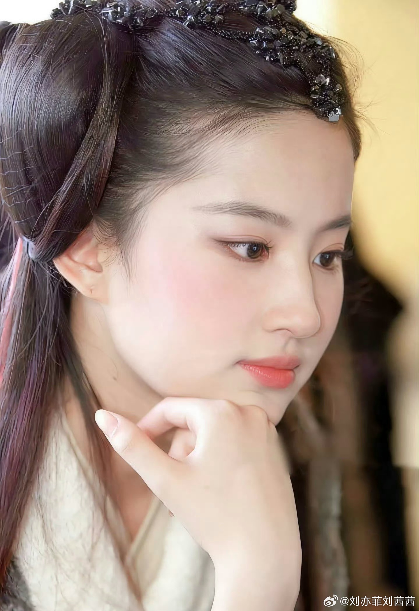 在这样的氛围下,刘亦菲的眉眼更显清澈柔和,肌肤细腻如雪,神情恬静灵动。