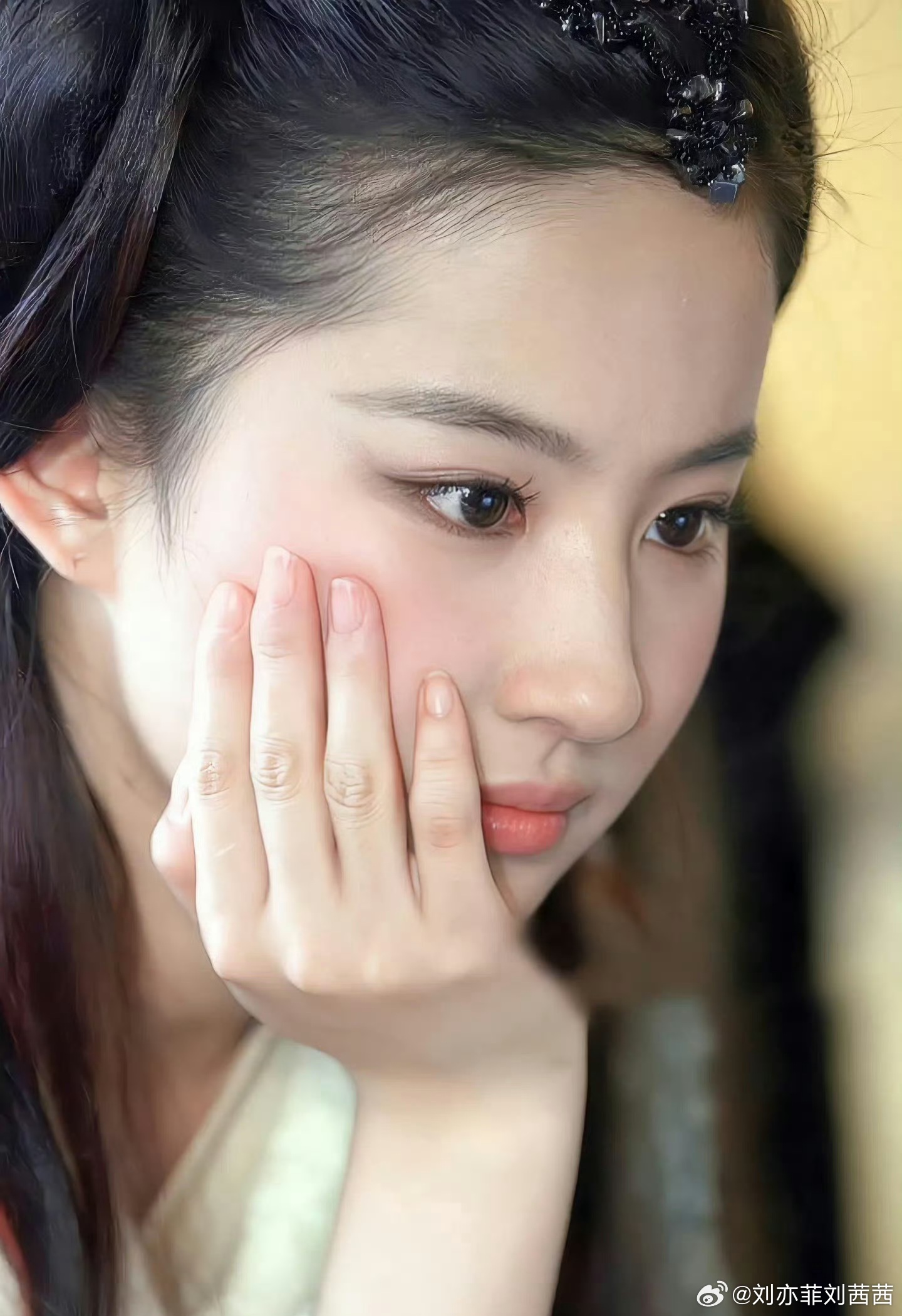 她的长发被黑色碎钻发饰轻轻挽起,几缕发丝自然垂落,更添几分慵懒与妩媚。