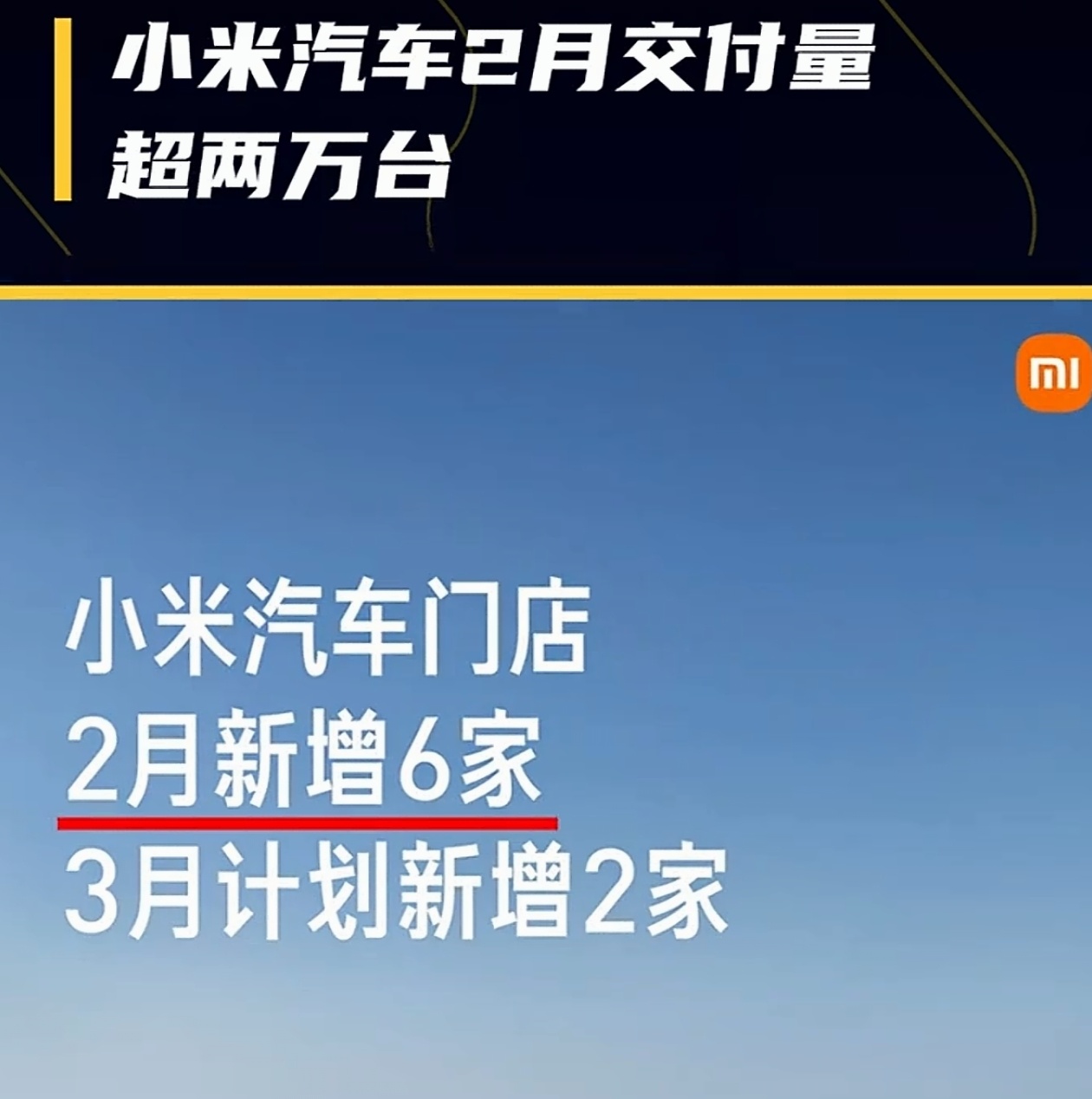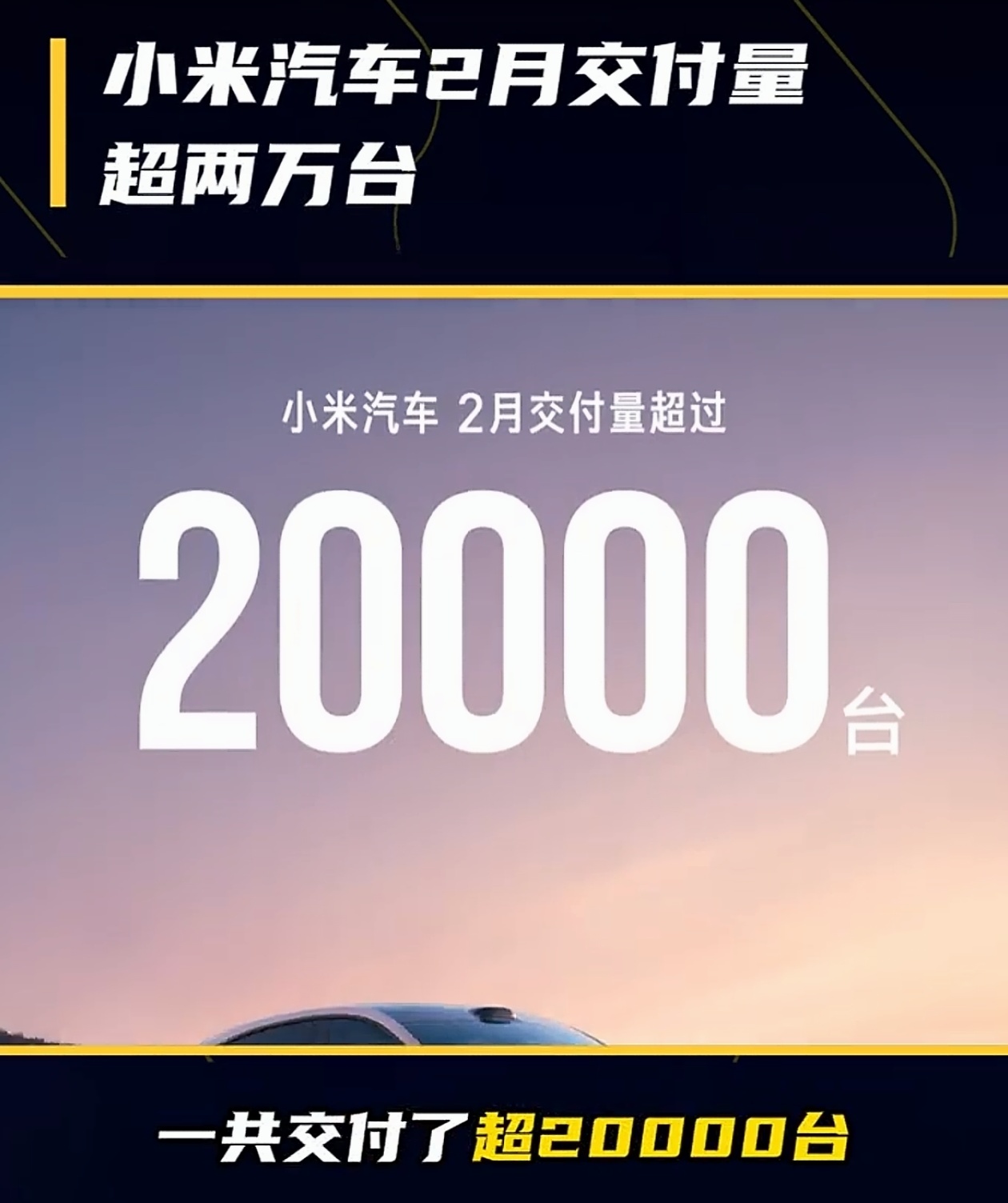 小米汽车2月交付:超20000台(2026-03-01官宣) 核心数据:2月交付超20000台;1月约3.9万台,环比回落但淡季韧性强。 主力车型:YU7独撑,初代SU7已停产,为新一代SU7腾产线。 2月仅28天+春节长假,有效交付仅约半个月。 累计交付已破60万台(22个月,行业最快)。 新一代SU7预计4月上市,预售价22.99万-30.99万。 全国门店488家(141城)、服务网点275家(159城)