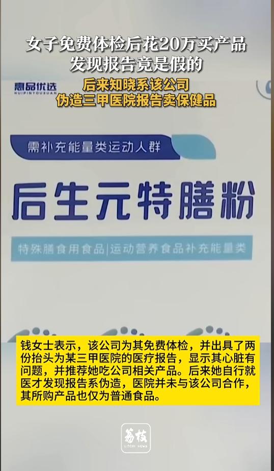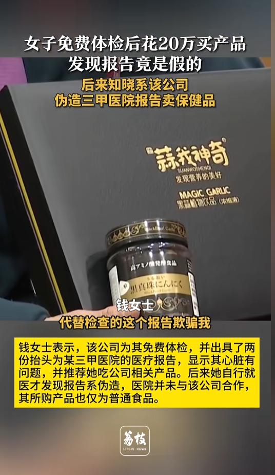 “必须严惩!”近日,江苏南京,一女子被家门口的某商贸公司吸引,进行了免费体检,对方还出具了抬头为某三甲医院的体检报告。该女子被诱导,先后多次花费近20万元购买该公司的保健品。谁知不久后体检报告居然是伪造的!网友:保健品的水太深了! 据媒体2月28日报道,钱女士某日出门时,被家门口的一家商贸公司吸引。对方称可以进行免费体检,还可以参加公司组织的旅游活动。 钱女士心动了,接受了该公司体检的邀请。之后,对方给她出具了两份医疗报告,抬头为某三甲医院。公司工作人员对钱女士说,报告显示她的心脏有问题,并且给她推荐了公司的相关产品。 就这样,在这家商贸公司的诱导下,钱女士先后花费近20万元,购买了该公司的保健品。不久后,钱女士自行到医院就行,没想到却发现了一个天大的谎言。 原来,该三甲医院的工作人员说,他们和这家商贸公司没有任何合作关系,钱女士收到的医疗报告是伪造的。她买的也不是什么保健品,就是普通的食品。 这可把钱女士气坏了,她找到商贸公司进行理论。钱女士尚有17万元的货物没有提货,公司仅同意退还14万元。于是钱女士向公安机关及市场监督部门报了案。 网友看后表示,这不是赤裸裸的欺诈么!居然敢伪造医院的报告,真够“刑”的!希望官方能尽快查明案件,对于这种劣迹公司,必须予以严厉的制裁,绝不姑息! 信息来源:《女子免费体检后花20万买产品 发现报告竟是假的 后来知晓系该公司伪造三甲医院报告卖保健品