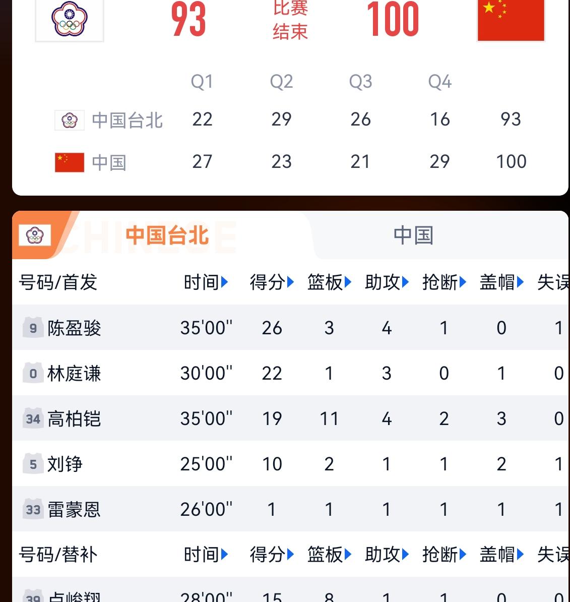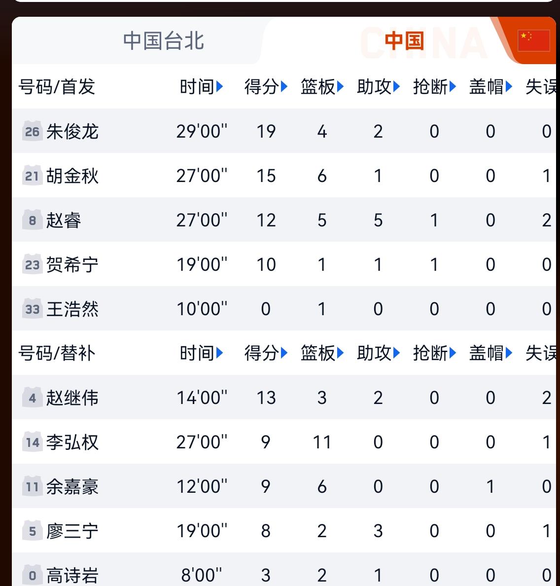 中国男篮10:93中国台北队,世预赛亚洲区生死战中国男篮第二胜,感谢赵继伟,全场比赛2分38秒距离篮筐9米的超远程三分和李弘权,在朱俊龙被顶伤后的神勇发挥,保证了中国男篮100:93取得最后的胜利。两胜之后中国男篮掌握了出线的主动权。