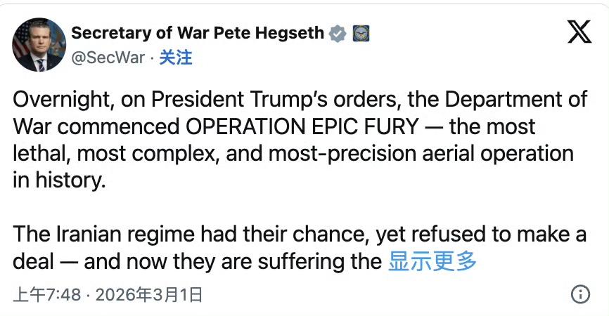 美国国防部长赫格塞斯把话撂出来了:伊朗海军,将被彻底摧毁。 他在社交媒体上发文,说美军已经放开所有行动限制,目标就是特朗普定下的那几条。伊朗敢用导弹打美国人,那这些导弹就得被炸掉,生产导弹的设施也得一起端,伊朗海军一个都跑不了。 这话是在伊朗反击之后说的。2月28日,美以联合发动了“史诗狂怒”行动,特朗普亲自出来宣布,说要打掉伊朗的核能力,炸平他们的导弹工业,顺便把海军也灭了。 那天德黑兰挨了七枚导弹,总统府、最高领袖官邸附近都炸了。伊朗国防部长纳西尔扎德,还有大概四十个官员,当场身亡。 伊朗没等太久。他们的反击很快,用了“法塔赫1”高超音速导弹,速度十五马赫,直接突防以色列的防空系统。巴林的第五舰队基地被炸,卡塔尔的美军设施也挨了打。霍尔木兹海峡那边,伊朗威胁要封,油价当天就跳了百分之八。 为什么打这么狠?核谈判三天前刚破裂。美国要伊朗彻底弃核,伊朗不干。美以分工也清楚,以色列盯着导弹设施和高官,美军负责海军的核设施。有分析说,这是“以打促谈”,用军事压力逼伊朗回来谈。 但这话听着像套话。欧盟提前把伊朗革命卫队列为恐怖组织,等于给美军行动披了件“反恐执法”的外衣。法律上的障碍,早就铺平了。 平民那边,惨状已经出来了。伊朗一所小学被炸,五十一个孩子死了。特朗普自己也承认,军事行动可能导致美军伤亡。 伊朗的导弹藏在底下,还有两千多枚。他们想用饱和攻击,把美以的防空系统耗光。美军那边弹药库存也只够高强度打四五天。这仗再往下打,谁耗得过谁,还真不好说。 二十多个国家发了旅行警告,中国驻伊朗使馆通知公民撤离。世界杯那边也有动静,伊朗今年是参赛国,能不能去成,现在没人敢打包票。 赫格塞斯那句“摧毁伊朗海军”喊得响,但真打起来,海军的反击能力未必比导弹弱。美军怕陷入泥潭,伊朗拉着胡塞武装、真主党往外扩战线。这场仗打到最后,恐怕没有赢家。美国对伊朗开战