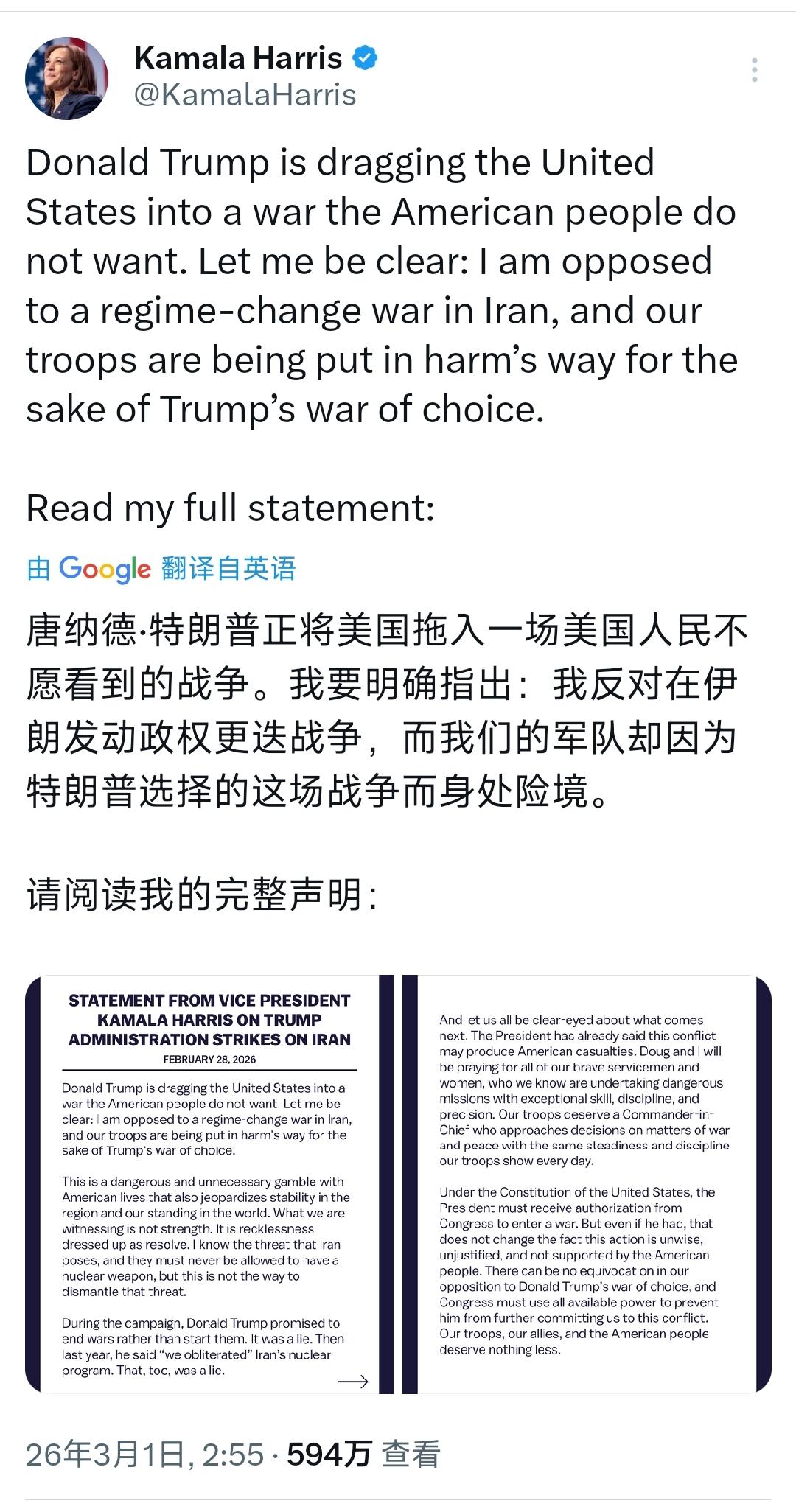 美国前副总统卡玛拉·哈里斯北京时间3月1日发文写道:“唐纳德·特朗普正将美国拖入一场美国人民不愿看到的战争。我要明确指出:我反对在伊朗发动政权更迭战争,而我们的军队却因为特朗普选择的这场战争而身处险境。” 特朗普为什么非要盯着伊朗不放,甚至不惜发动战争?其实这背后早就有谋划,甚至能追溯到17年前的一份智库报告。 这份由美国布鲁金斯学会发布的报告,简直就是一份推翻伊朗政权的“行动剧本”,里面详细写了如何通过煽动民众骚乱、联合反对派、甚至动用军事手段,一步步搞垮伊朗政权。而现在特朗普做的,几乎就是照着这份剧本在走。 就在今年年初,伊朗国内因为物价上涨、货币贬值爆发了骚乱,而有消息称,这场骚乱背后就有美国煽动的影子。 紧接着,特朗普政府开始在中东大规模集结兵力,部署了两艘航母、上百架战机,这是自从2003年美国打伊拉克以来,在中东摆下的最大规模兵力。 更关键的是,特朗普已经听取了针对伊朗的军事打击选项汇报,甚至公开表示,已经为对伊行动预留了多条“退路”,一副志在必得的样子。 但哈里斯说的没错,这场战争,美国人民根本不愿意看到。根据美联社的民调,超过一半的美国人不相信特朗普政府能在境外使用武力上做出正确决定,就连特朗普的前政治盟友,也站出来批评他违背了“停止对外战争”的竞选承诺,称这场战争其实是“为以色列而打”。 毕竟,上一次美国对伊朗发动军事打击,也就是2025年6月的“午夜之锤”行动,不仅没能达成目标,反而让美国陷入了更大的麻烦。 那次行动中,美国出动上百架战机,目标是摧毁伊朗的核设施,可最终不仅没能瘫痪伊朗的核计划,反而暴露了自己的军事局限,还激起了伊朗的强硬反击。 伊朗当时就明确表示,会把美国在中东的军事基地当作合法打击目标,而伊朗支持的黎巴嫩真主党、也门胡塞武装,也开始频繁袭击美军基地,让美国陷入了被动。 如今特朗普再次加码对伊行动,风险只会更大。要知道,现在有大约4万名美军驻扎在中东的13个军事基地,而伊朗已经明确警告,任何形式的袭击都将被视为侵略,会发起全面报复。 更关键的是,伊朗已经关闭了霍尔木兹海峡,这条海峡承担着全球五分之一的海运石油出口,一旦长期关闭,全球油价会大幅飙升,美国民众的生活也会受到直接影响,通胀压力会进一步加大。 哈里斯反对的,不仅仅是一场战争,更是特朗普这种不计后果的激进政策。事实上,特朗普政府内部也存在严重分歧,美军参谋长联席会议主席就曾提醒他,对伊军事行动可能让美国陷入长期冲突,而国务卿、副总统等人也对动武的风险有所顾虑。 毕竟,伊拉克战争、叙利亚内战的教训就在眼前,战火一旦开启,就没人能控制它的走向,最终受伤的还是普通士兵和民众。 哈里斯作为前副总统,她的表态虽然带有一定的政治立场,但不可否认的是,她说出了很多美国人的心声。 现在的美国,一边是特朗普政府的强硬动武姿态,一边是国内民众的反对和国际社会的谴责,还有伊朗的强硬反击,局势已经陷入了僵局。 没有人希望看到战争升级,可特朗普的激进操作,正在把美国一步步拖入泥潭。哈里斯的发声,或许无法立刻阻止局势恶化,但至少让更多人看清了这场战争的本质——它不是为了美国的安全,而是特朗普为了自身政治目的和地缘利益,不惜牺牲美军士兵的安全、牺牲美国民众的利益,发动的一场不必要的战争。 接下来,美伊局势会如何发展,特朗普是否会继续加码,我们只能持续关注,但有一点可以肯定,任何靠战争解决问题的方式,最终都只会得不偿失。