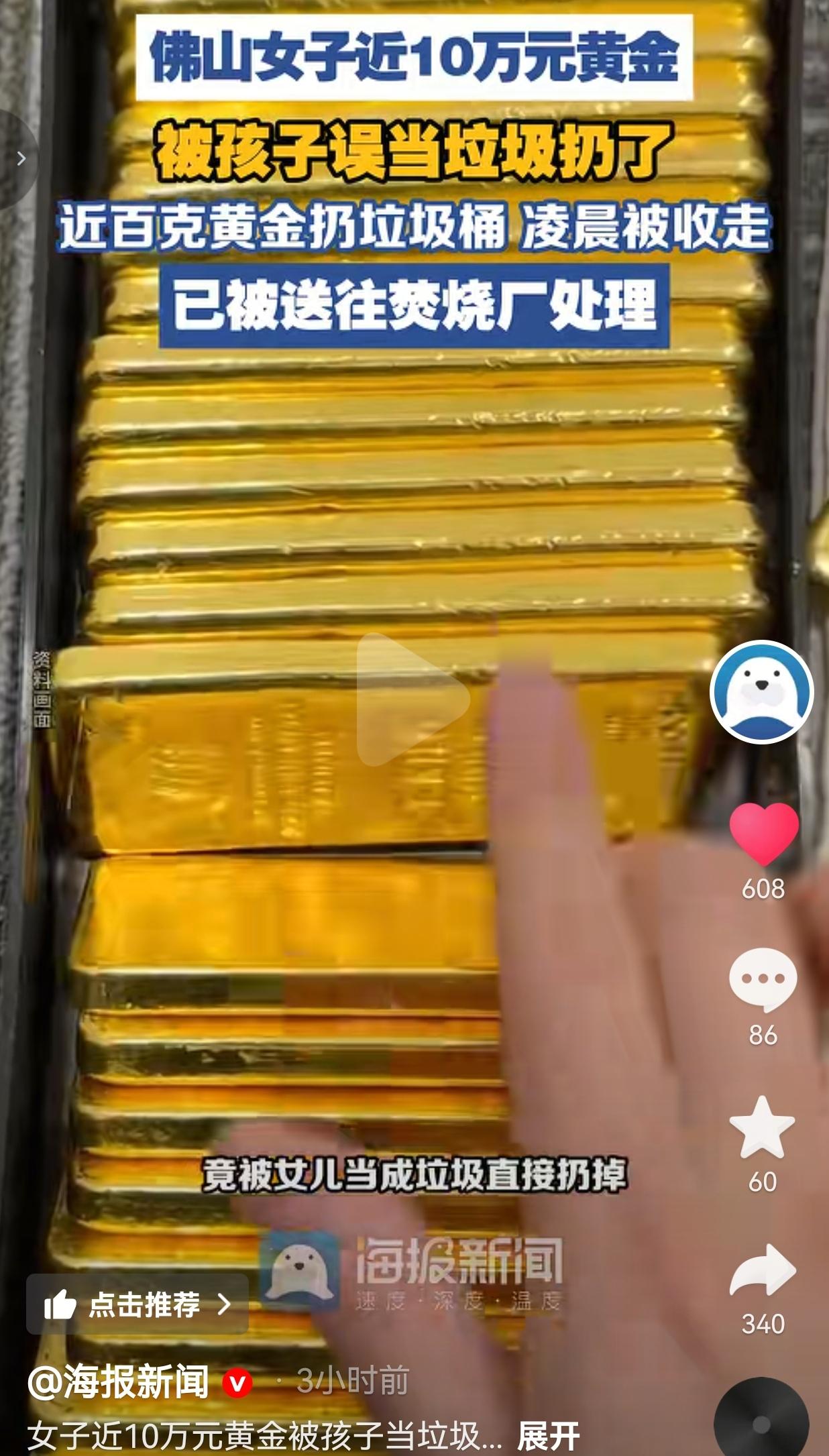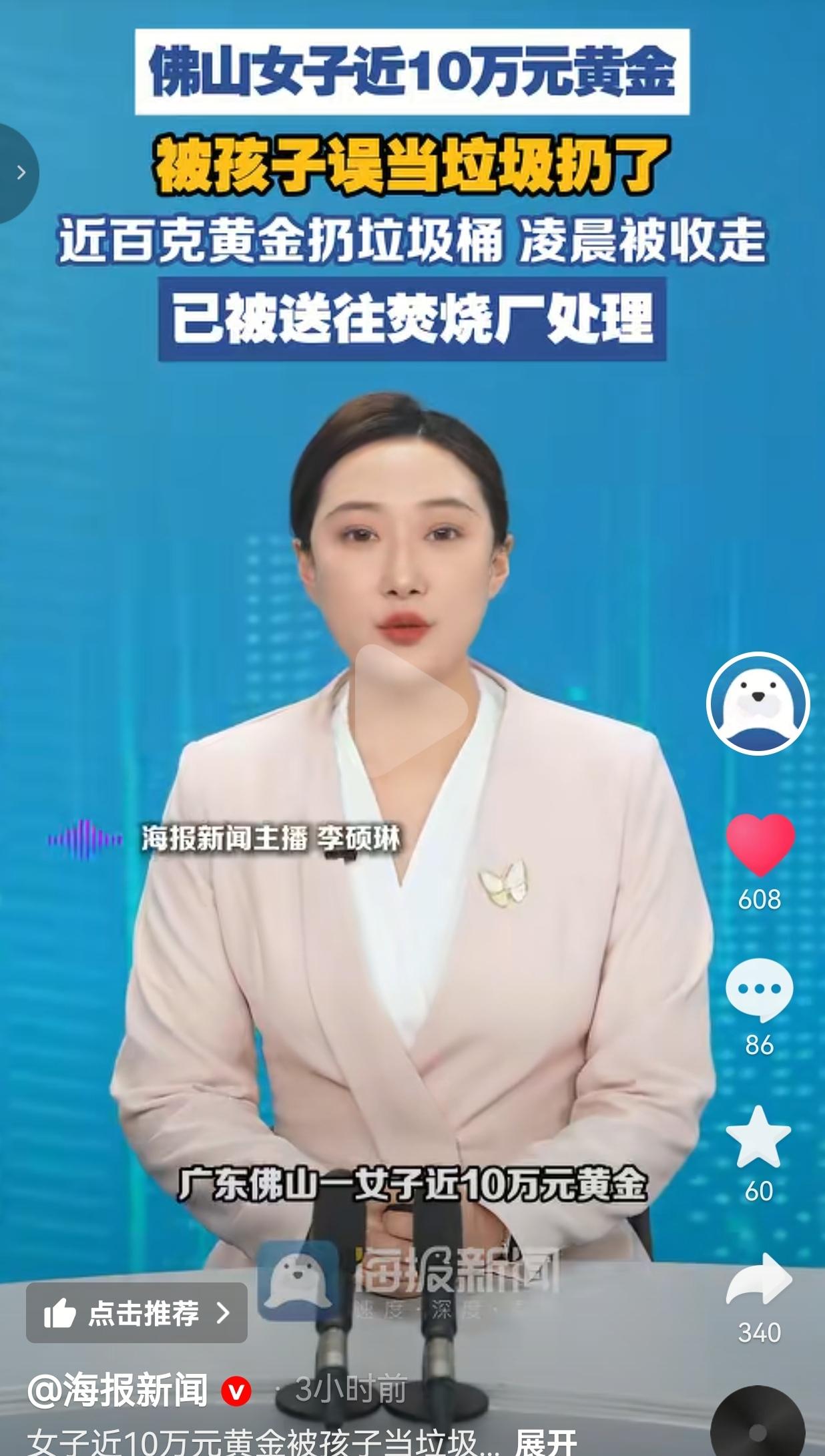 天塌了!佛山妈妈10万黄金被女儿当垃圾扔了,13小时后才发现,垃圾已进焚烧厂… 近日,广东佛山的陈女士经历一场“天塌了”的噩梦。 那天,她像往常一样,把装着近百克黄金的塑料袋随手放在了茶几上。里面有一条80克的男士金项链,还有戒指、耳环、小金牌,算下来差不多10万块钱。 对普通家庭来说,这可不是小数目,可能是攒了好久的家底,也可能是给家人准备的念想。 早上7点多,女儿在家打扫卫生,看到那个不起眼的塑料袋,想都没想,就当成没用的垃圾,顺手丢进了小区的垃圾桶。 而陈女士呢?她完全没想起这回事。直到晚上8点,她准备出门,想戴首饰的时候,才猛地一拍大腿:“我的黄金呢?!” 一家人疯了一样冲到楼下的垃圾桶,可那里早就空空如也。物业说,垃圾上午就被清运车收走了。 他们赶紧联系环卫公司,得到的消息像一盆冰水从头浇到脚:那批垃圾,27号下午就已经被送到焚烧厂处理了。 近10万的黄金,就这么跟着一车厨余废纸,变成了炉子里的灰烬。陈女士说,那一瞬间,她真的感觉“天塌了”。 目前,相关事宜仍在跟进,但黄金被焚烧处理的事实,已经像一块巨石压在她心头。 网友看到后评论说:这哪是垃圾,这是“心碎现场”啊! 也有的网友说: “10万啊!够我家还两年房贷了,这心是有多大才随手放茶几上啊?” 还有的网友说: “最惨的是,13个小时才发现!这13个小时里,黄金从垃圾桶到清运车,再到焚烧厂,一步步走向死亡,想想都窒息。” 说实话,我刚看到这个新闻的时候,第一反应是“太惨了”,但转念一想,这不就是我们生活里的缩影吗? 陈女士的“随手一放”,不是心大,是我们太容易对“熟悉的东西”失去警惕。 我们总觉得,“反正就在家里,跑不了”,可家里的东西,也会被当成垃圾扔掉,也会在我们的疏忽里,悄悄消失。 更扎心的是,这10万黄金,对很多人来说可能是一年的收入,是孩子的教育基金,是给老人的看病钱。它不是冷冰冰的数字,是一家人的底气和希望。 可就因为一个小小的疏忽,这一切都没了。 这件事最让人难受的,不是黄金没了,而是那种“明明可以避免,却偏偏发生了”的无力感。 我们总在等“下次注意”,可生活里哪有那么多下次? 贵重的东西,别随手放;重要的事,别等“有空再说”;爱你的人,别等“以后再陪”。 因为你永远不知道,哪一次“随手”,就会变成一辈子的遗憾。 大家觉得呢?欢迎大家评论区讨论留言。