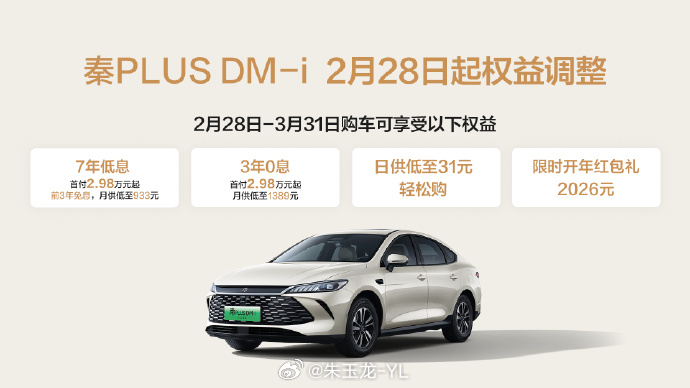 比亚迪,这次也下场了,秦PLUS史上最强金融政策:7年低息、3年0息,首付2.98万起,日供低至31元。秦PLUS DM-i和EV还额外送2026元开年红包