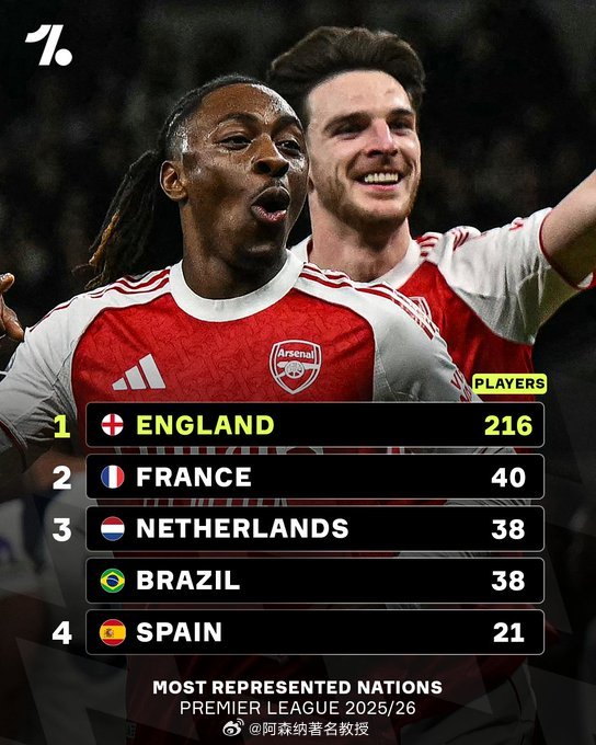 本赛季英超联赛中参赛球队最多的国家,英格兰遥遥领先英超联赛阿森纳著名教授