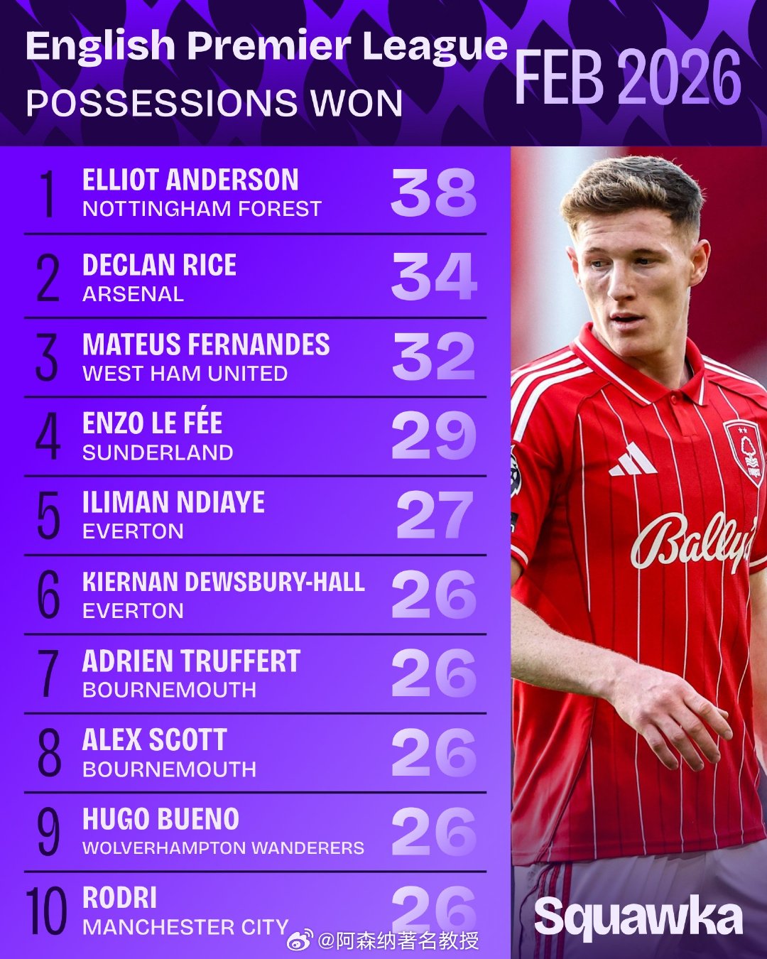 二月份英超联赛中控球次数最多的球员英超联赛阿森纳著名教授