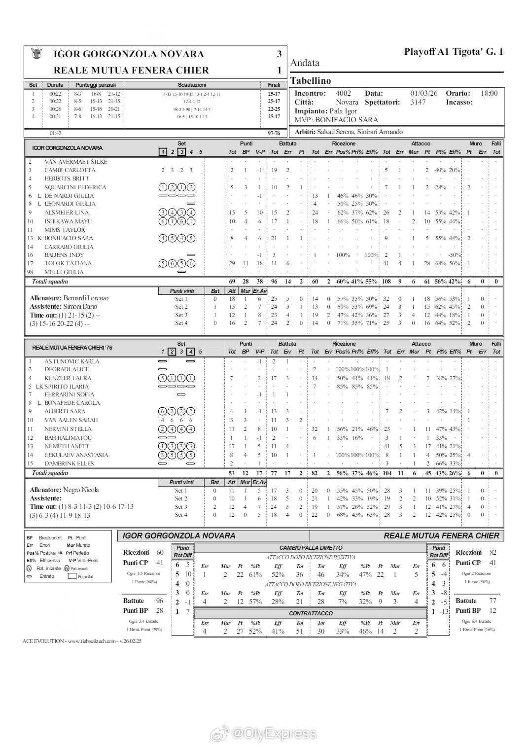 【意甲女排1/4决赛诺瓦拉3-1基耶里 米兰3-0瓦莱福里亚】国际排坛战报速递 3月1日,意甲女排1/4决赛首回合,诺瓦拉主场3-1(25-17/25-17/22-25/25-17)击败基耶里。托洛克29分、阿尔斯迈尔15分、石川真佑10分、MVP博尼法西奥8分,内梅斯17分、内尔维尼11分。米兰主场3-0(25-20/25-15/25-19)零封瓦莱福里亚。MVP拉涅尔20分、埃格努20分,比希13分。