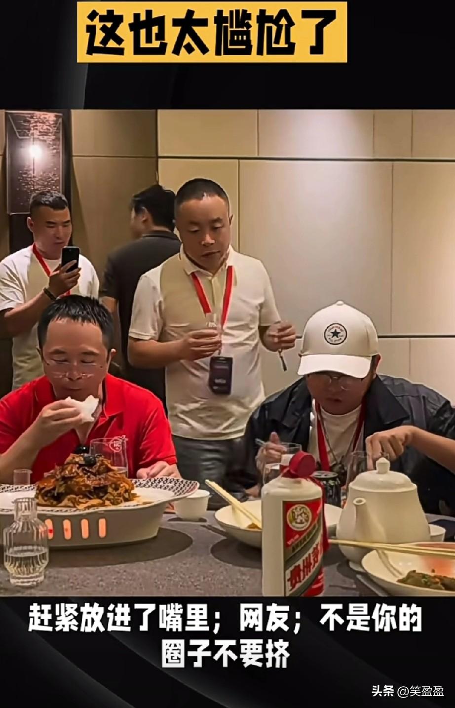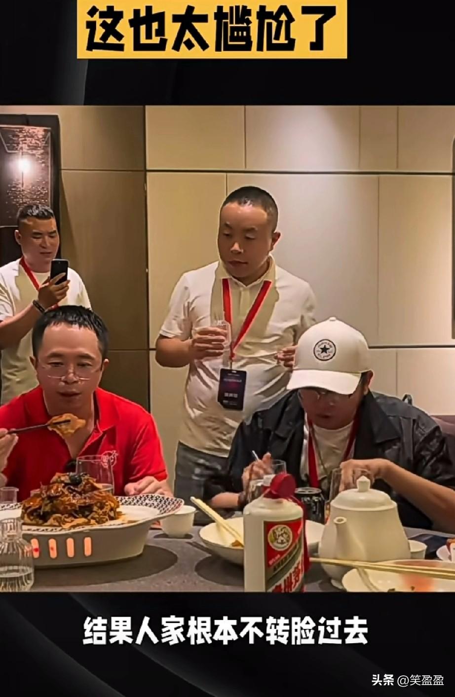 这也太尴尬了, 后面这位小哥想敬大佬一杯酒, 结果人家根本不转脸过去, 直接无视,自己夹起一块肉赶紧放进嘴里,网友说,不是你的圈子不要挤!