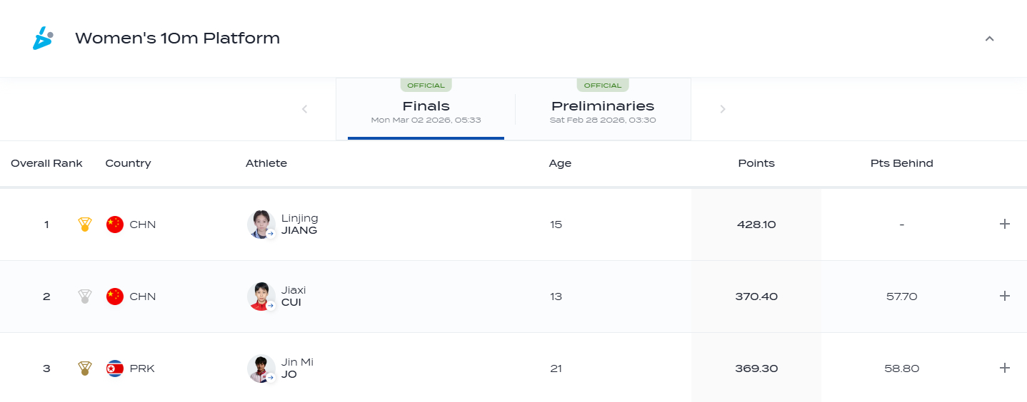 蒋林静总分428.10获得冠军,崔家溪总分370.40获得亚军#2026跳水世界杯#