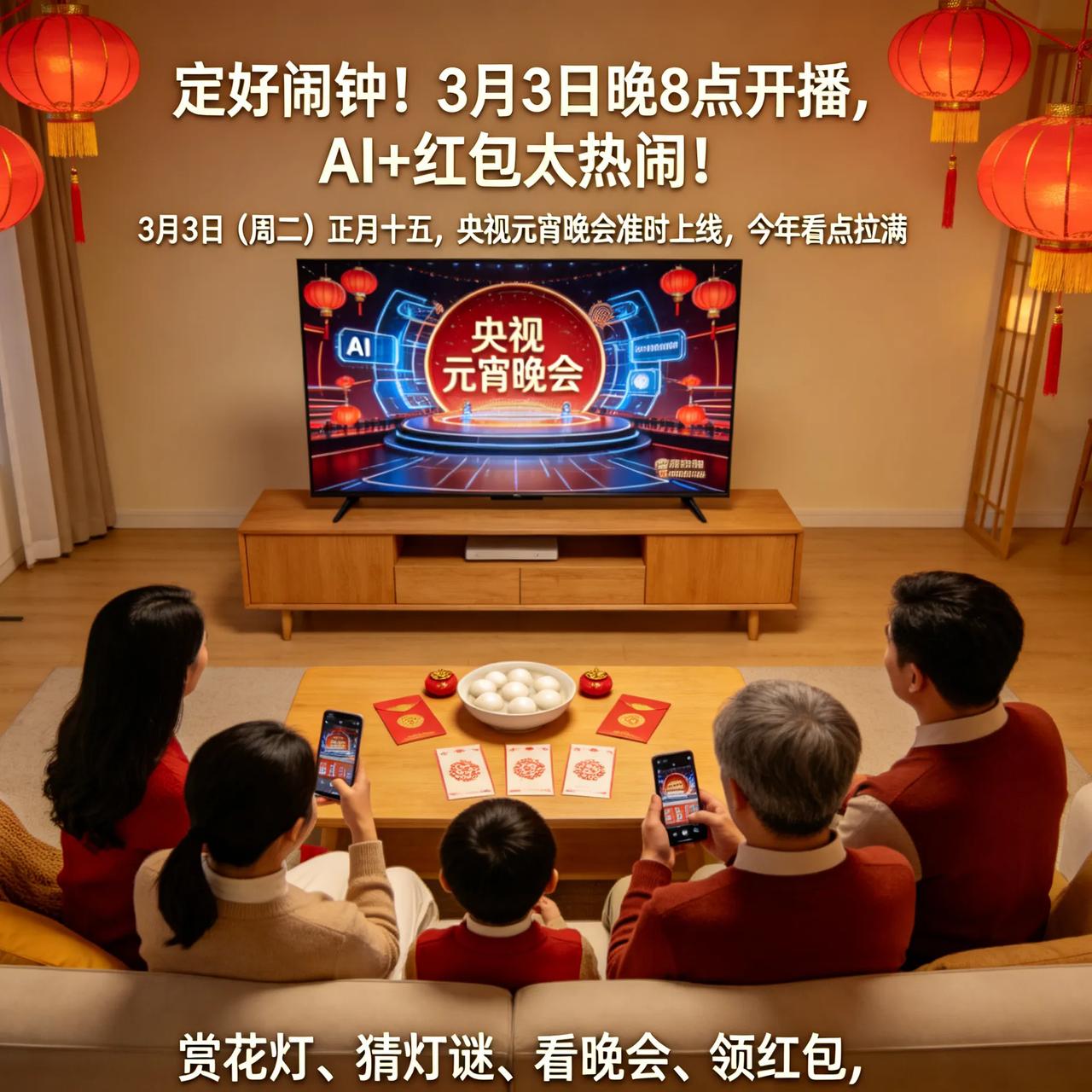 定好闹钟!元宵晚会3月3日晚8点开播,AI+红包太热闹! 注意看!3月3日(周二)正月十五,央视元宵晚会准时上线,今年看点拉满。 今年晚会大量融入AI科技,舞台更炫、节目更潮,还有趣味AI灯谜互动,全家都能参与。直播期间还有红包福利,边看边抢,喜气加倍。 赏花灯、猜灯谜、看晚会、领红包,一家人团团圆圆,把年味闹到最足。 今晚你家准备看晚会、猜灯谜吗?最期待哪个节目? 元宵晚会 元宵节快乐 团圆年味马年元宵晚会 元宵节综艺晚会 元宵晚会