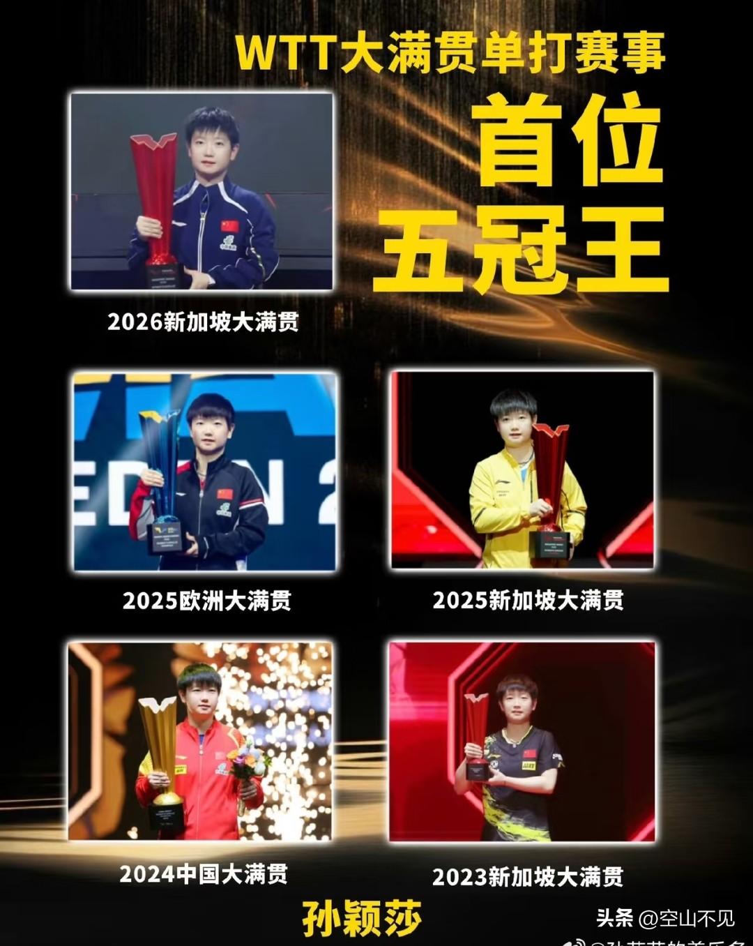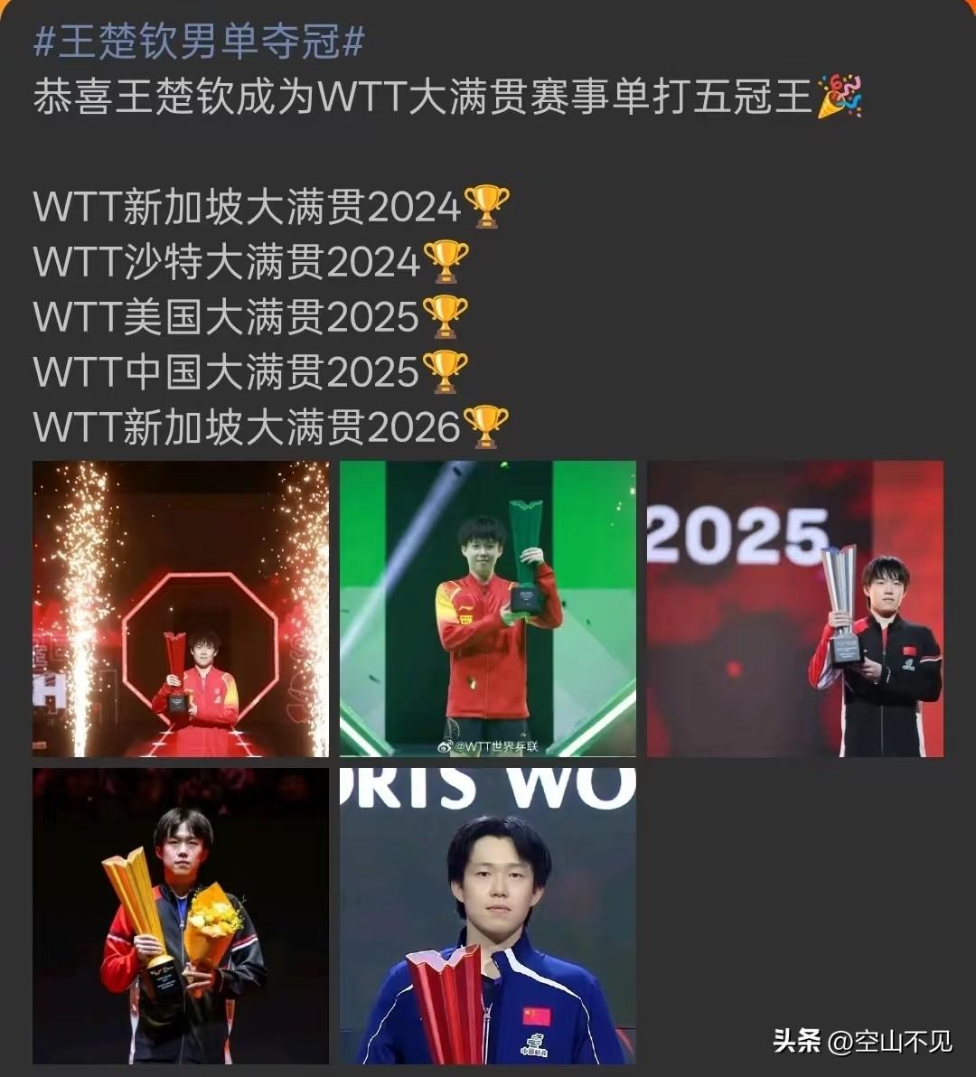 分则各自为王,合则天下无双 孙颖莎首位WTT大满贯赛事女子单打五冠王 王楚钦首位WTT大满贯赛事男子单打五冠王 莎头组合WTT大满贯赛事混双五冠王 一路走来都没落下,你没有的我有,我没有的你有,这次我们都有,第五冠顶峰相见,终于等来了大满贯的同频。 我的小福将齐头并进,用实力诠释了脚步一致的人不会走散。继续朝梦想出发。 王楚钦