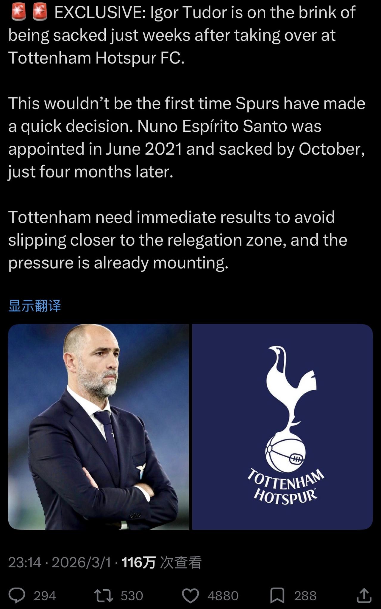 热刺 这是要和 森林 拼:谁单赛季解雇主教练多? 热刺这群球员,装鱼腩,演着演着,假戏成真了[呲牙]。 ……………………………………………………………… 独家报道:伊戈尔·图多尔接手托特纳姆热刺足球俱乐部仅几周后就面临被解雇的危机。 这并非热刺第一次迅速做出决定。努诺·埃斯皮里托·桑托于2021年6月上任,仅仅四个月后,也就是同年10月就被解雇了。 托特纳姆热刺队需要立即取得成绩,以避免滑向降级区,而压力已经越来越大。