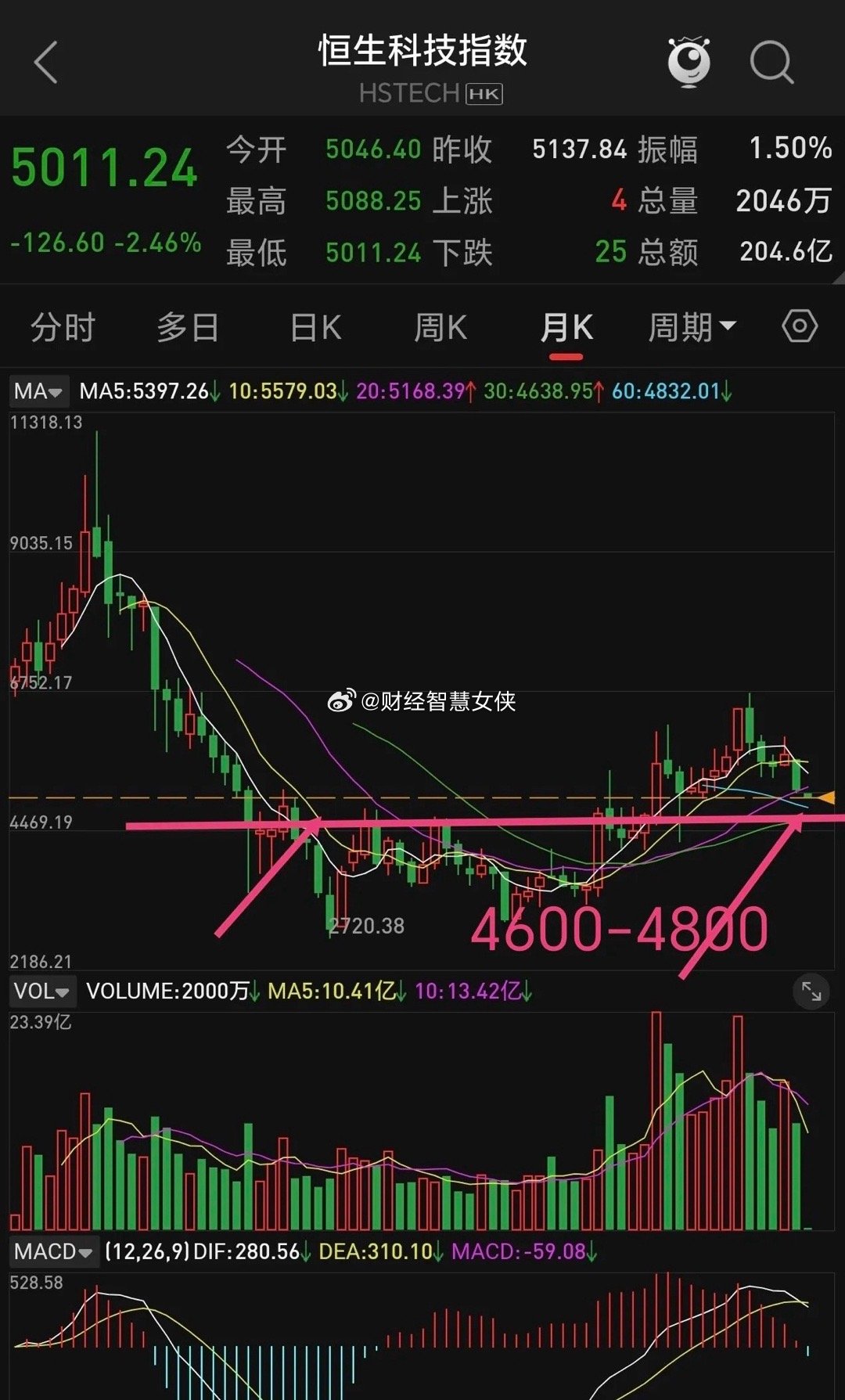 恒科基本上按照本人预测趋势运行,上周提示了,近期奔5000点,今天就到了,从它的月线走势分析(如下图所示),下一个目标就是4800点---4600点,4600点左右是比较舒服的介入点位,本人计划到时候再出手,目前就是看戏等待,也许途中有反弹,但是,中途反弹一下还会继续寻找支撑。这个板块不能玩短线,只能做长线,否则难赚钱。 个人观点仅供参考,不构成投资依据。点赞转发评论关注,投资理财不迷路。股票