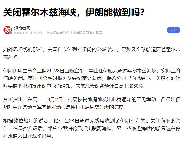 伊朗真能关上霍尔木兹海峡?这事不简单,连保险公司都慌了 2月28号晚上,伊朗伊斯兰革命卫队直接宣布,不让任何船过霍尔木兹海峡,等于把这条海峡真的关上了。 消息一出来,立马出了连锁反应,英国《金融时报》说,保险公司已经通知要过这条海峡的船,取消它们的保险,而且接下来几天,保险费最多要涨50%。 保险公司这么着急,还没到3月2日周一交易的时候就发通知,这种情况很少见。这也能看出来,伊朗报复性打击中东的美军基地后,中东局势越来越紧张。 很多人都问,伊朗说关海峡,是真能做到,还是只是吓唬人? 首先得说,霍尔木兹海峡是个关键地方,它是波斯湾往印度洋走的唯一一条路,全球五分之一的石油、近五分之一的液化天然气,都得从这过。 咱们加的汽油,很多也从这运过来,尤其是亚洲国家,大部分进口石油都走这。 而且这条海峡不宽,最窄的地方才39公里左右,北边就是伊朗的海岸线,伊朗在岸边就能派船、放导弹、布水雷,不用跑远路,这就是它最大的优势,不用费太大劲就能控制海峡。 再说伊朗的实力,它不像美国那样有大型航母,靠的是很多小型快艇,还有导弹、无人机和水雷。 伊朗的海军和革命卫队海上部队,一共有1500多艘船,大部分都是小型快艇,速度快,还能装导弹,一群快艇一起上,就能威胁大型油轮。 另外,它还有能装无人机的改装商船,能远程监控和打击过往船只,还有五千多枚智能水雷,船一经过就可能引爆,商船根本不敢轻易过。 这次大家这么当真,和以前不一样,因为2月28号当天,美国和以色列先动手打了伊朗,连伊朗的总统府、革命卫队总部都打了,这已经触碰到伊朗的底线,伊朗没办法,才报复美军基地,还关上海峡,这不是吓唬人,是真被逼急了。 现在已经有很多船不敢走这条航道了,经过的船少了70%,还有50多艘油轮停在伊朗附近,等着看局势变化。 保险公司也不傻,要是伊朗没本事关海峡,不会随便取消保单、涨保费,他们就是怕船被攻击、被扣押,才提前避险。 不过大家也不用太担心,伊朗能关海峡,但不会一直关着,因为它65%的收入都靠卖石油,海峡一直关着,它自己的石油也运不出去,赚不到钱,经济就垮了。它这次就是想施压,让美国和以色列停止打击。 有人担心美国会强行打通海峡,美国确实有这个实力,但伊朗打法灵活,不用硬碰硬,用快艇、无人机骚扰,美国要打通也得付出大代价,还会遭到报复,所以美国也不敢轻易动手。 就算海峡关几天,全球石油也不会断供,沙特、阿联酋有备用管道能绕路运石油,但要是长期关着,油价肯定会涨,咱们加油可能会更贵。