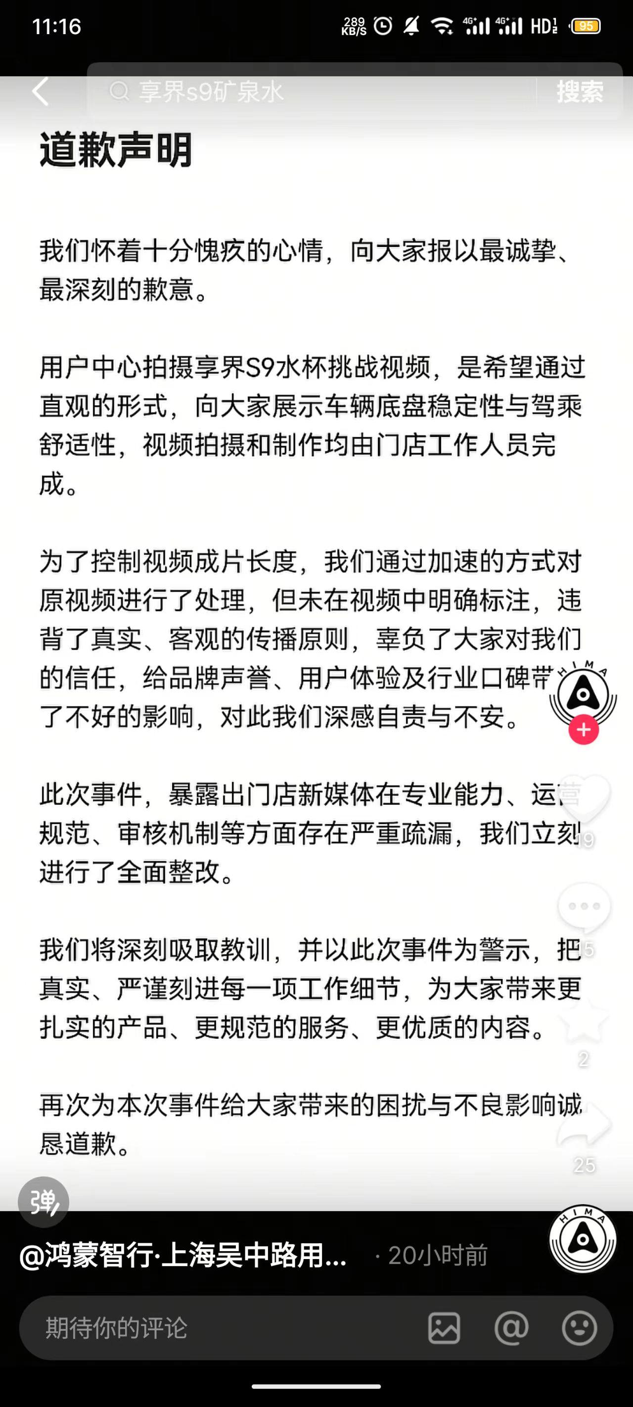 月 2 日,鸿蒙智行上海世纪公园、吴中路两家用户中心的官方抖音账号发布道歉声明,就此事公开致歉。 目前,鸿蒙智行已对涉事门店作出处罚,包括责令限期整改、扣除绩效分数及门店激励,并要求经销商对相关责任人进行经济处罚与问责。同时,鸿蒙智行要求所有门店引以为戒,严格遵守品牌规定与法律法规,诚信合规经营。