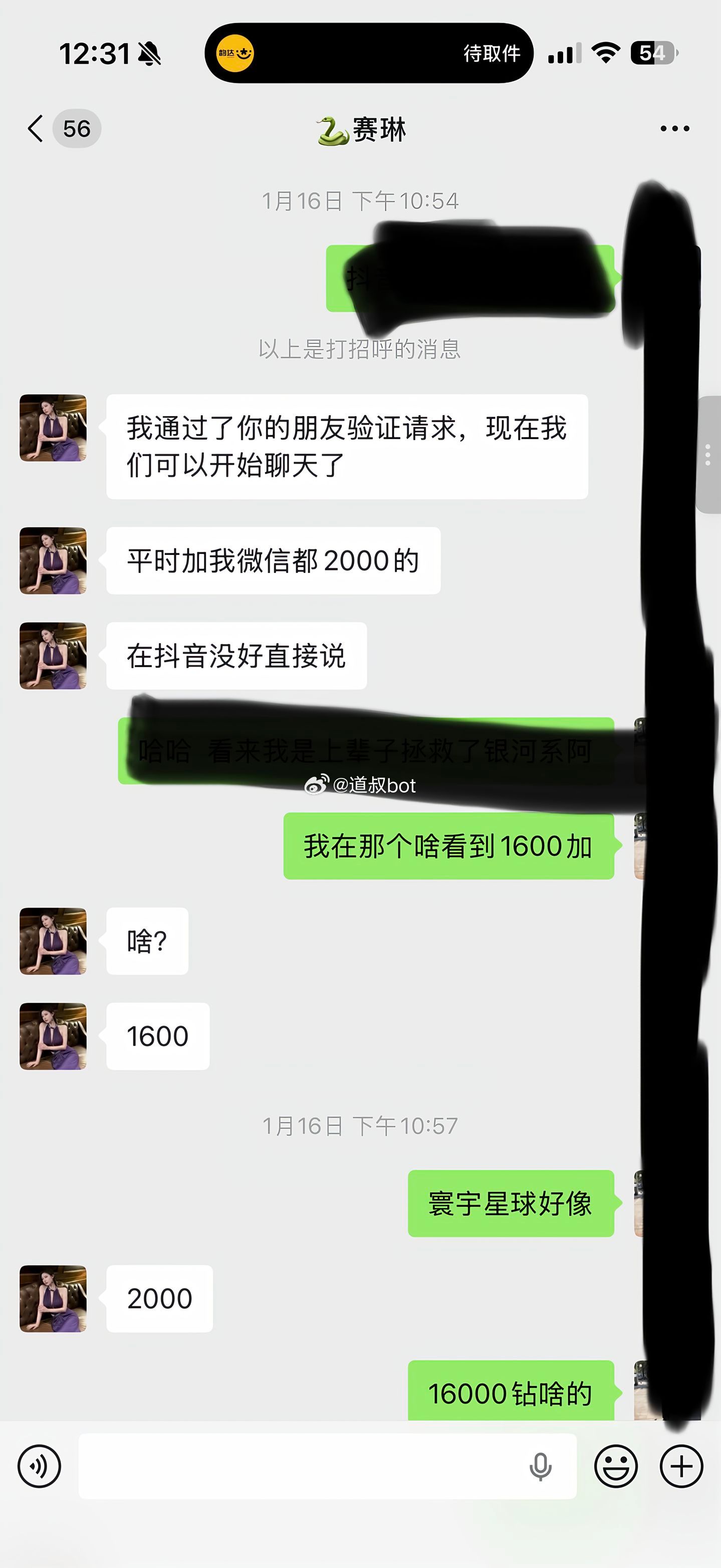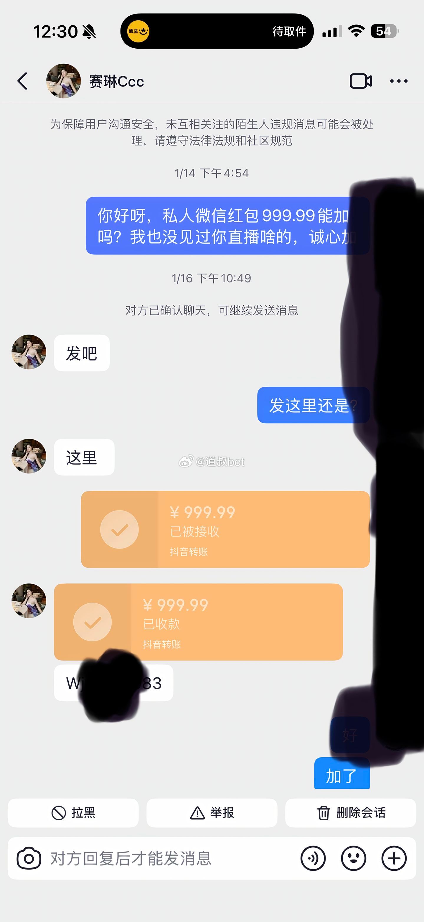 网友爆料,私加网红赛琳微信,花了1000元,最后被拉黑。这兄弟有点压抑啊……