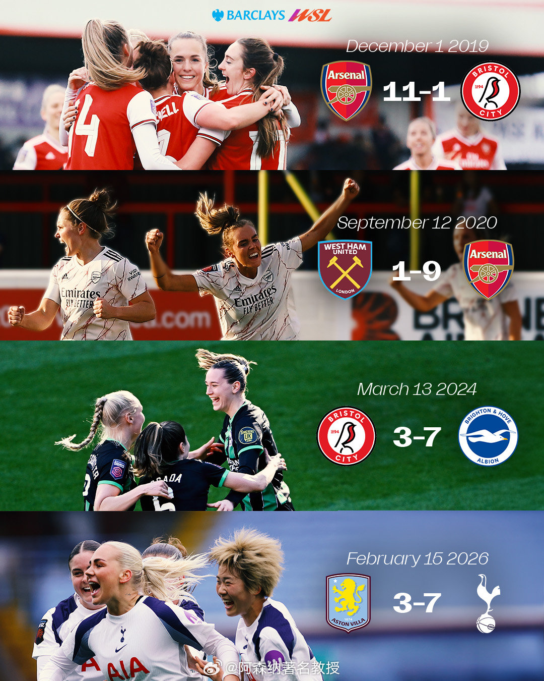 进球!进球!进球!在巴克莱女子超级联赛的历史上,只有四场比赛的单场进球数达到或超过10个,阿森纳女足独占两场 英超联赛 阿森纳著名教授
