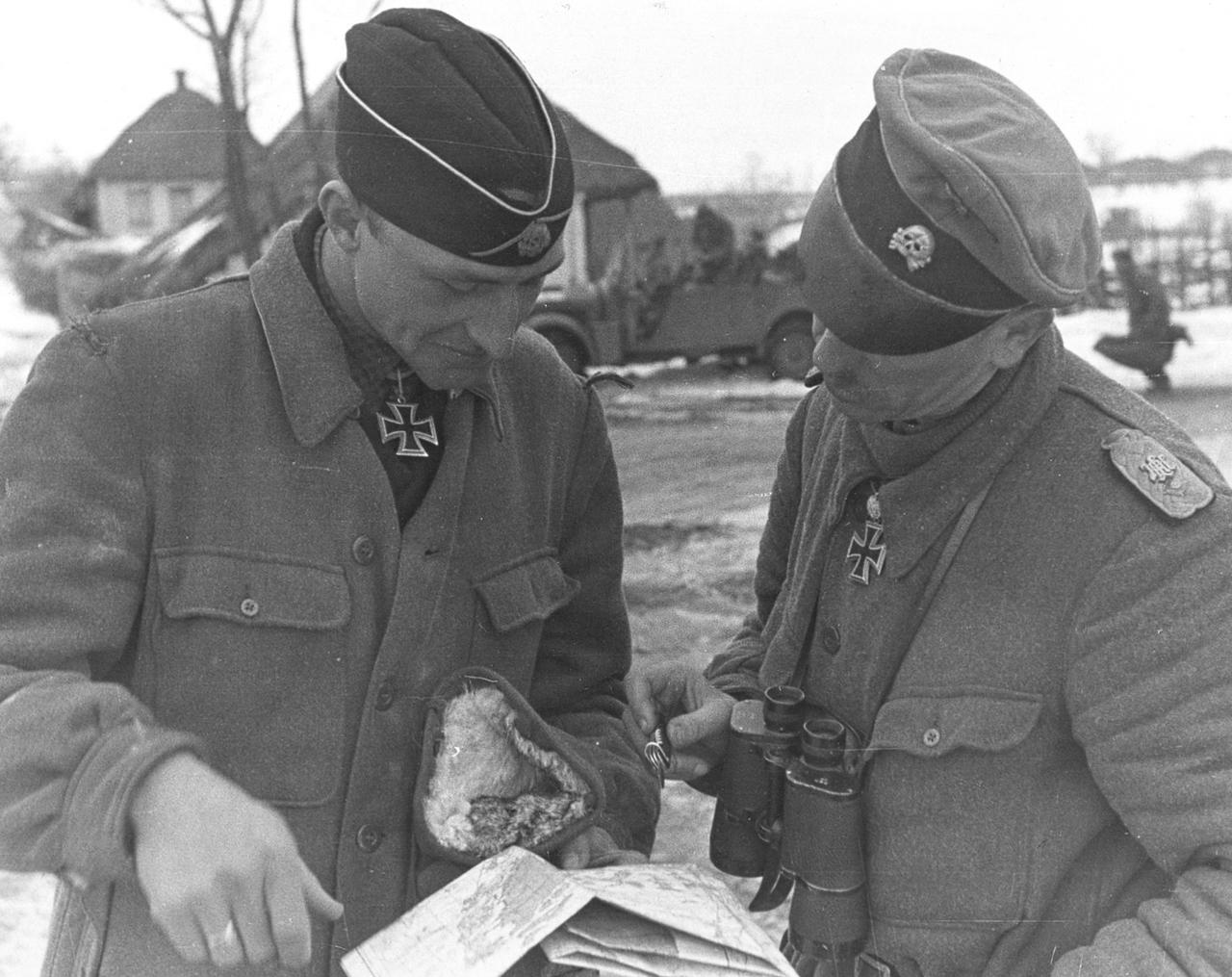 [呲牙] 党卫军的会师,“装甲迈尔”也来了——1943 年,党卫军第 3 “骷髅” 装甲师第 3 坦克团第 1 连连长 ——党卫军上尉 迈尔德雷斯,与党卫军第 1“阿道夫・希特勒警卫旗队” 装甲师第 1 侦察营营长 ——党卫军少校 库尔特・迈尔,在作战地图前研究战况。1943 年 3 月 9 日,党卫军第 1 师 与 第 3 师部队在哈尔科夫附近的佩列谢奇纳亚镇会师,参与哈尔科夫反击作战。 注1:1943 年 3 月第三次哈尔科夫战役,曼施坦因指挥德军南方集团军群发起反攻,重新夺回哈尔科夫。 注2:库尔特・迈尔(Kurt Meyer,参见图2),绰号 “装甲迈尔”,是党卫军知名指挥官。