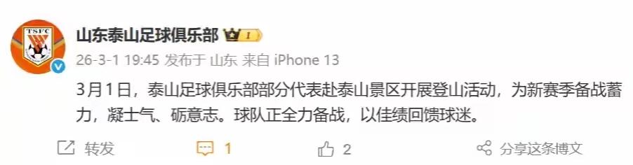 糊弄球迷?山东泰山昨天冒雪爬山,没有合照,官网一笔带过。 昨天有泰山球迷声称在泰山上看到宿茂臻、范学伟和一部分山东泰山球员爬了泰山。昨天泰山上风雪交加,爬山极其危险,下午泰山即封闭了登山入口。 昨天晚上,山东泰山俱乐部官网发布了一条简短消息,证实了山东泰山俱乐部确实在昨天爬了泰山,但是一张照片也没有,球员教练也没有和以前一样进行合影留念。 此前山东泰山俱乐部曾取消了今年登泰山的仪式,引发了球迷们的强烈不满。昨天俱乐部潦潦草草地爬泰山,更像是俱乐部糊弄球迷舆论的方式,不仅主力球员没去,练照片都不敢放一张,这样的登山祈福有什么意义?毫无诚心的登山,还不如不登。