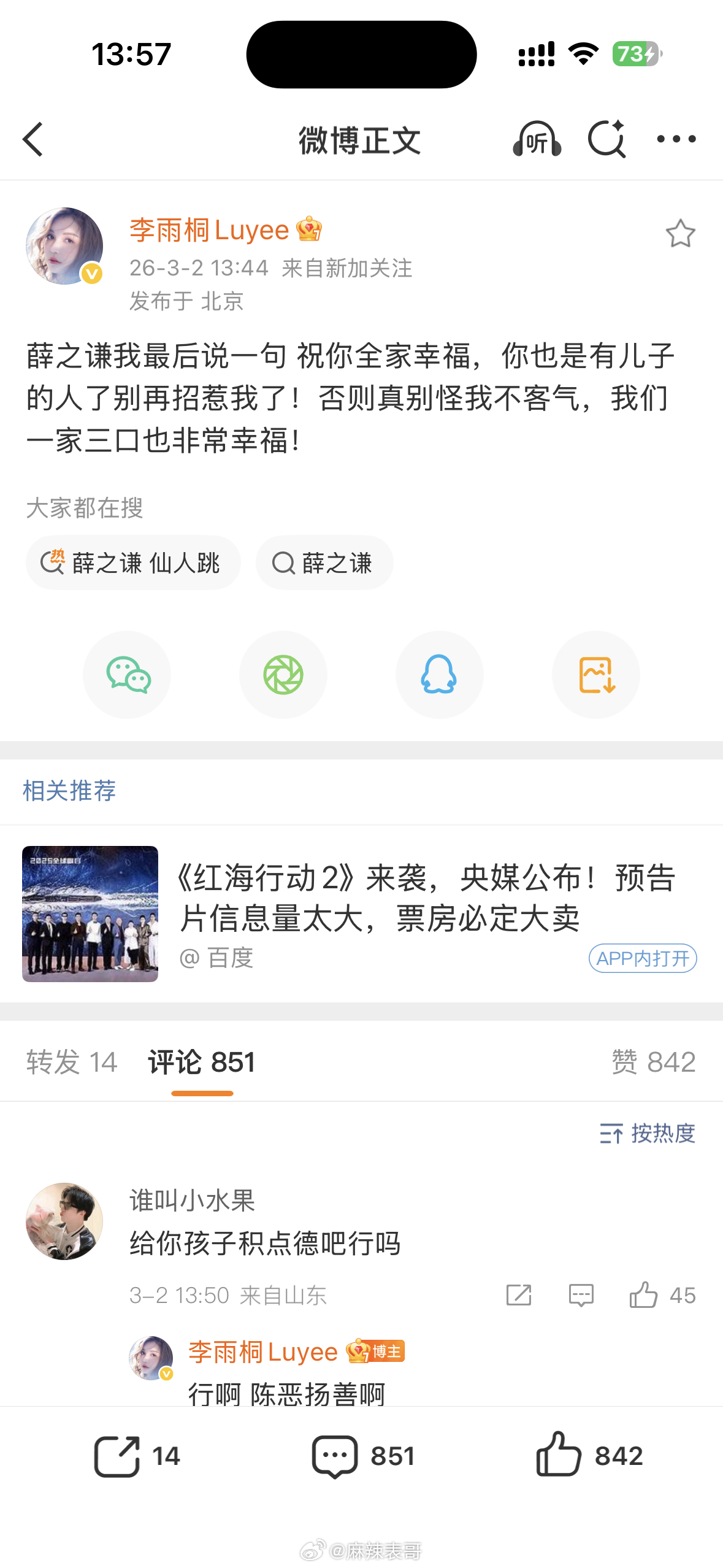 李雨桐再次喊话薛之谦,说薛之谦都有家庭的人了,不要再招惹自己