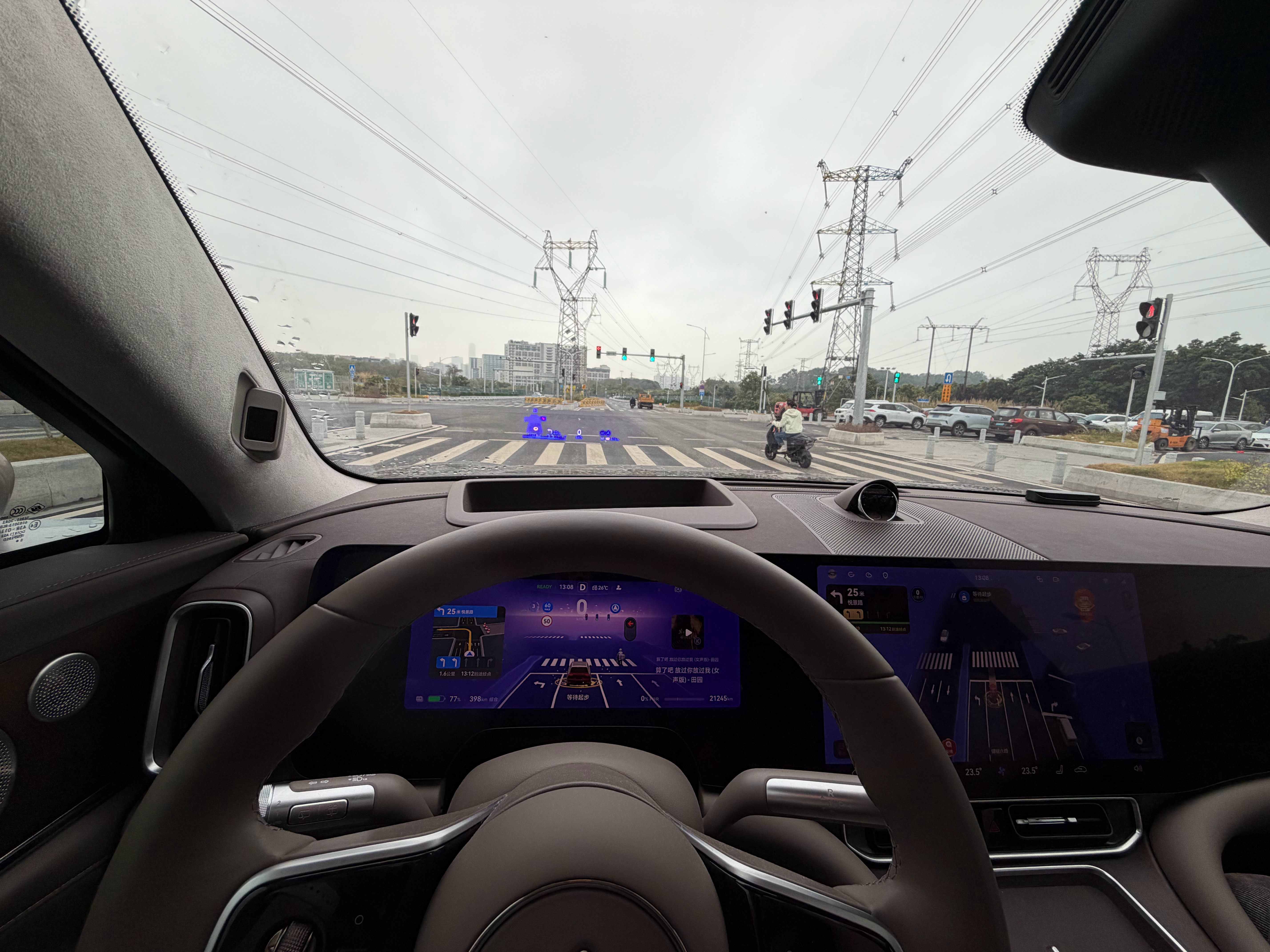 在安心感这块4.1真强啊,特别是防御性驾驶,我们遇到了一个场景,是在一个丁字路口下坡以后无保护右转➡️进道路,ADS是低速度探出头去,有电瓶车窜出来刹停然后再提速过去,整一个过程的的转弯幅度,速度控制,时延真的组合的很好