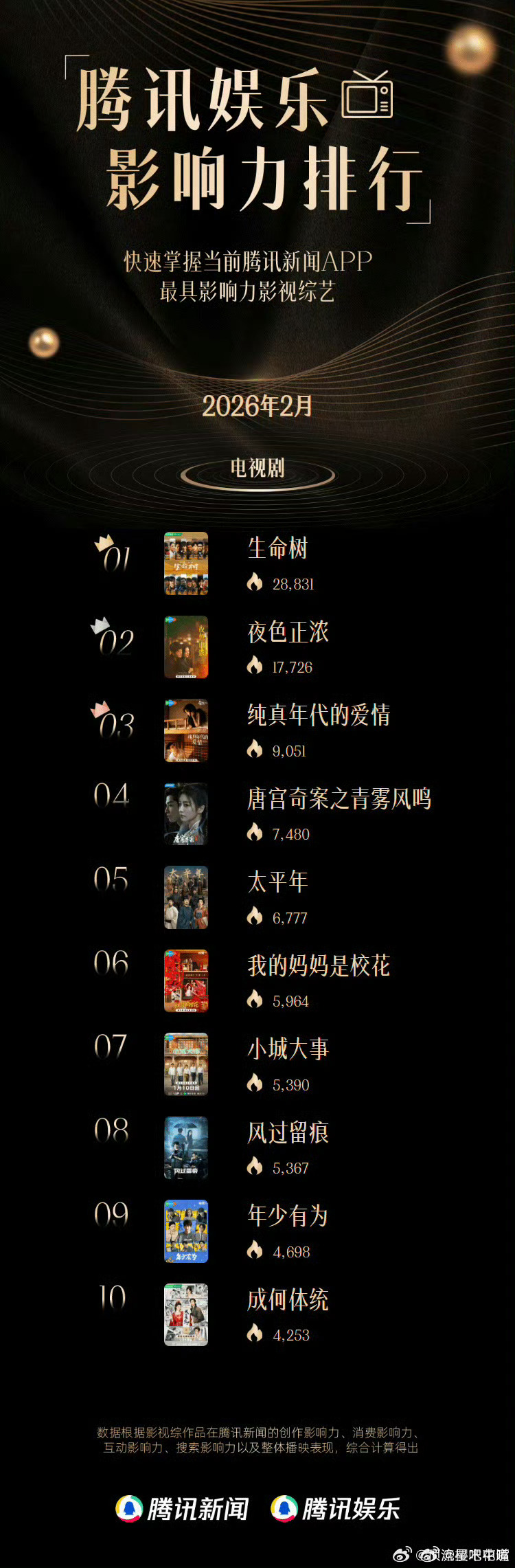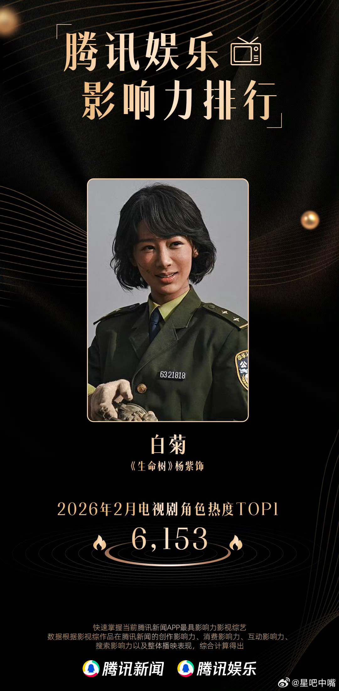 杨紫生命树斩获双榜TOP1】杨紫演技再获认可 3月1日,“腾讯娱乐影响力排行”2月榜单正式揭晓,由领衔主演的电视剧《生命树》凭借强劲口碑与市场热度,一举拿下2月电视剧热度冠军,杨紫饰演的角色“白菊”也同步登顶2月电视剧角色热度TOP1,实现“剧与角色”双冠加冕。此次双冠成绩,是对杨紫表演实力的又一次印证,期待杨紫带来更多优质作品与精彩角色!