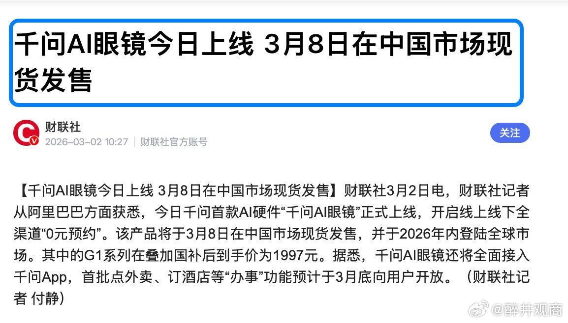 刚刚看到一个消息,忍不住和大家分享一下。那就是在3月2日的时候,千问首款AI硬件“千问AI眼镜”正式上线,线下线下0元预约,3月8日就在国内现货开售,预计2026年内登陆全球市场。