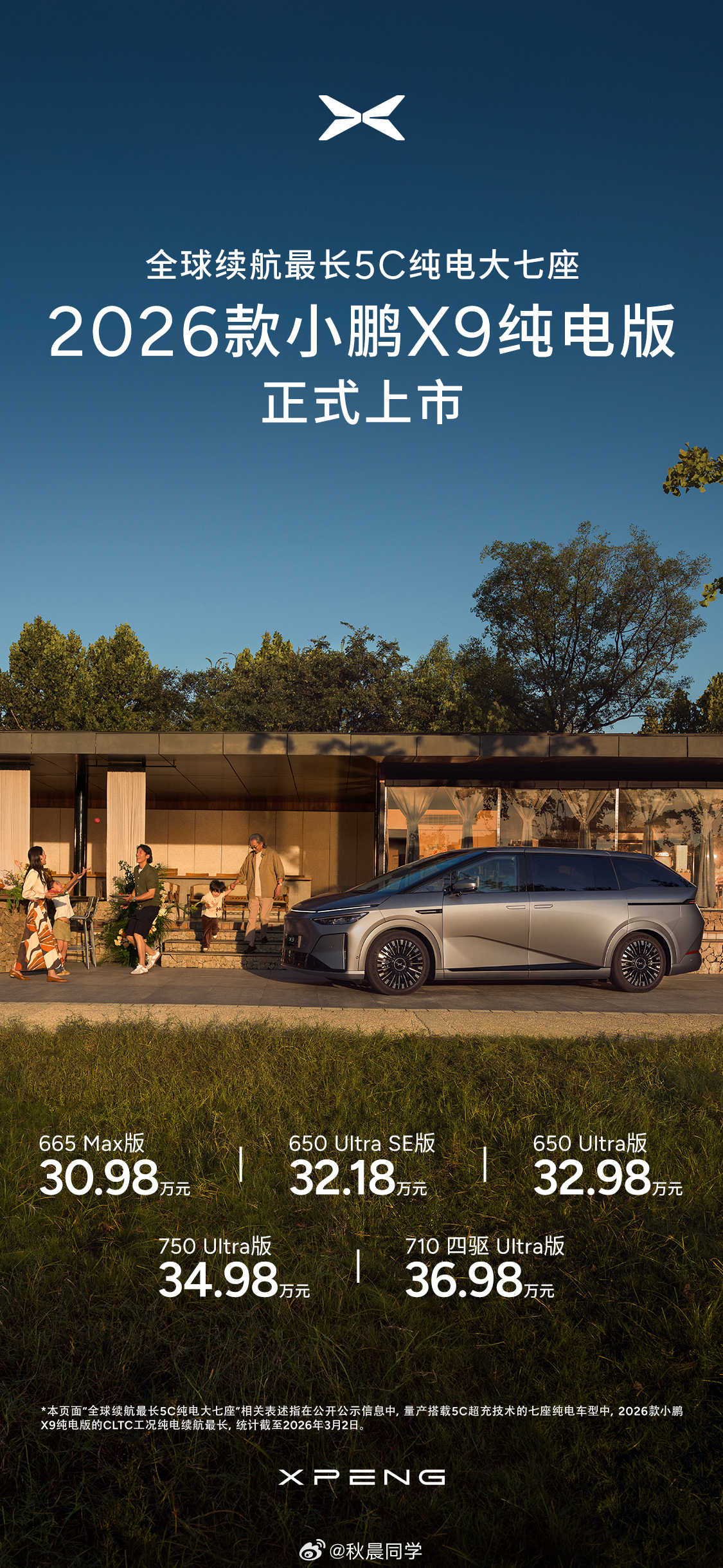 新款小鹏X9纯电版正式上市,售价30.98万元起: