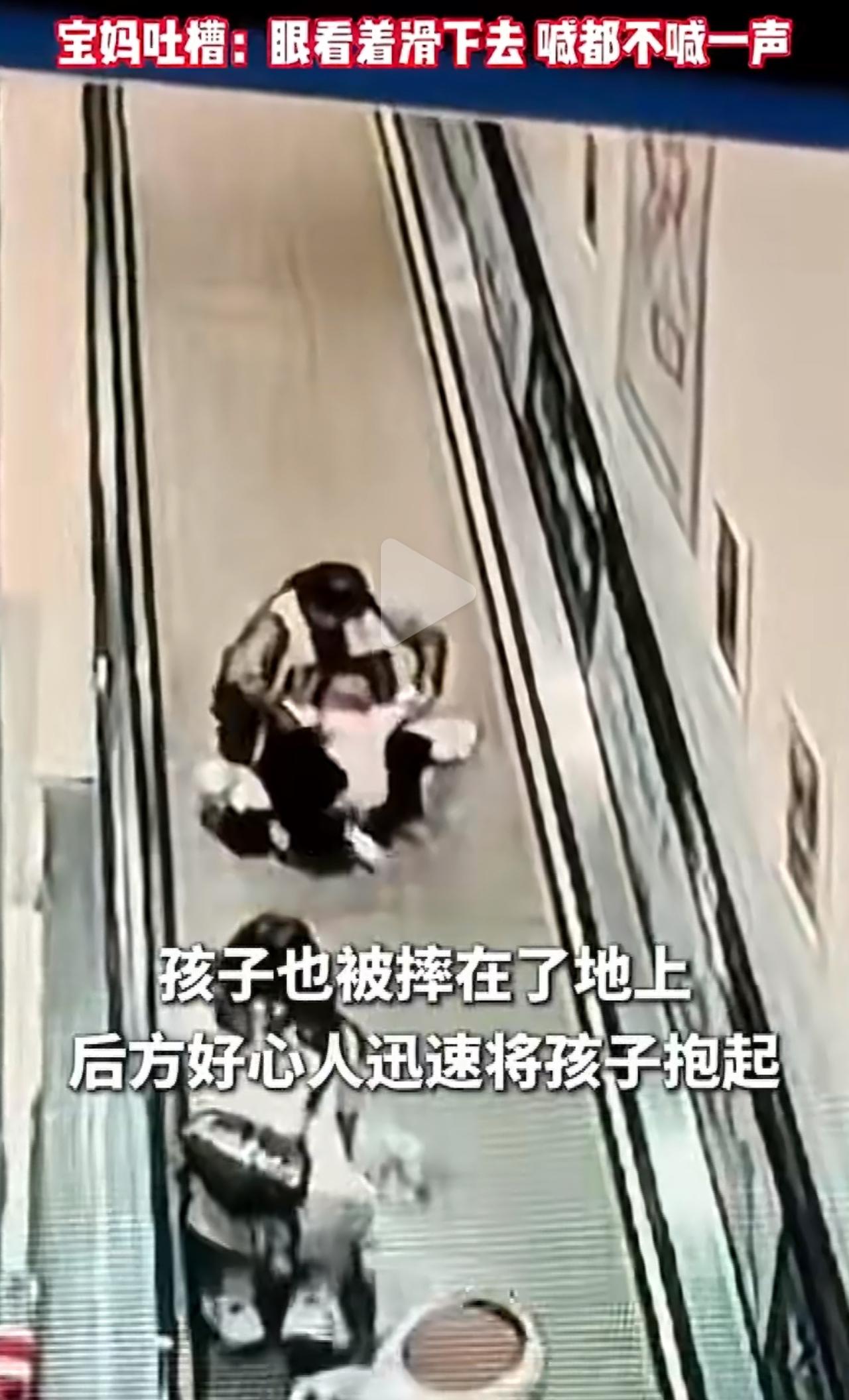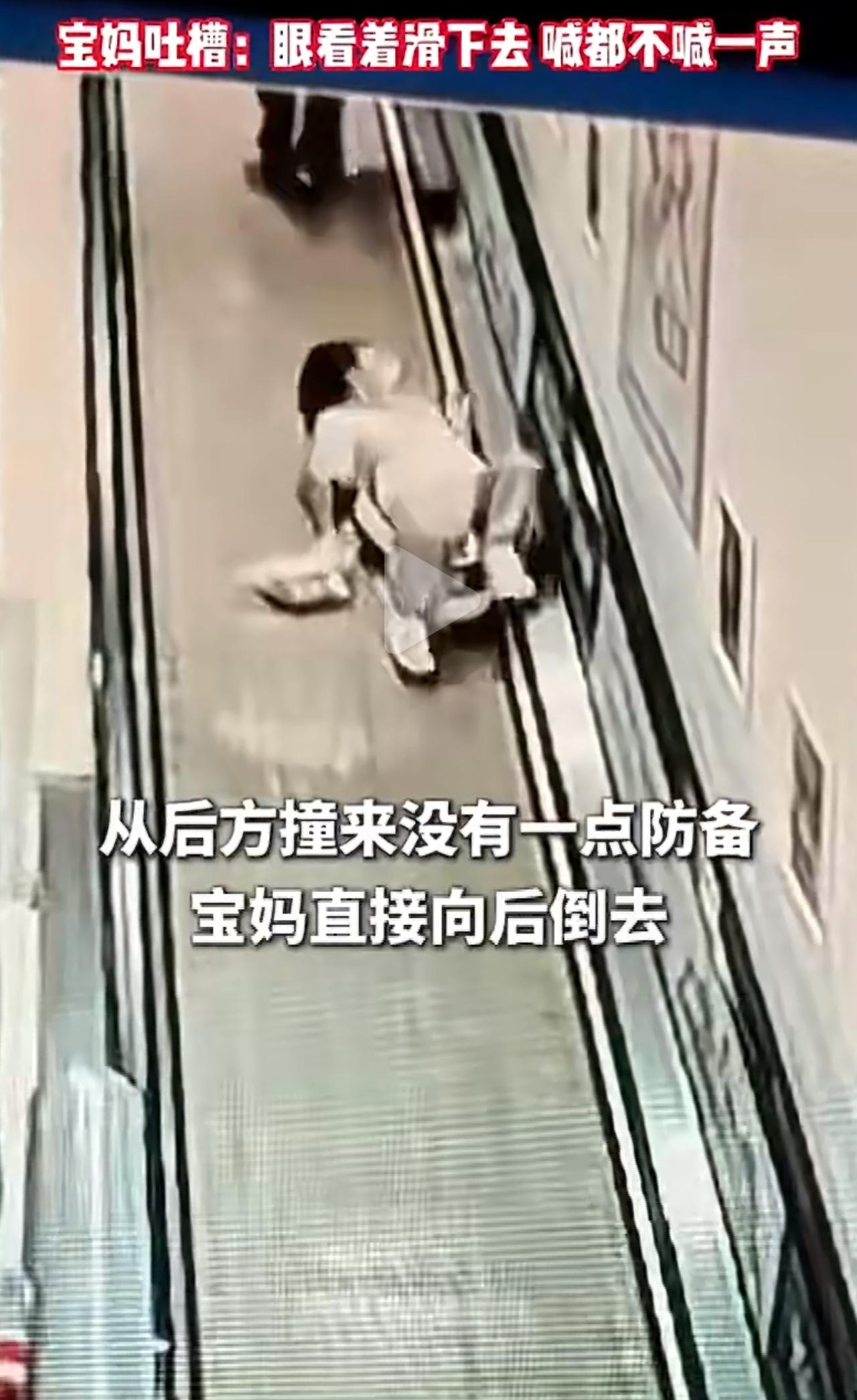 3月1号,云南一家商场,一位宝妈抱着宝宝正在下扶梯。后面有个家长,直接把没刹车的