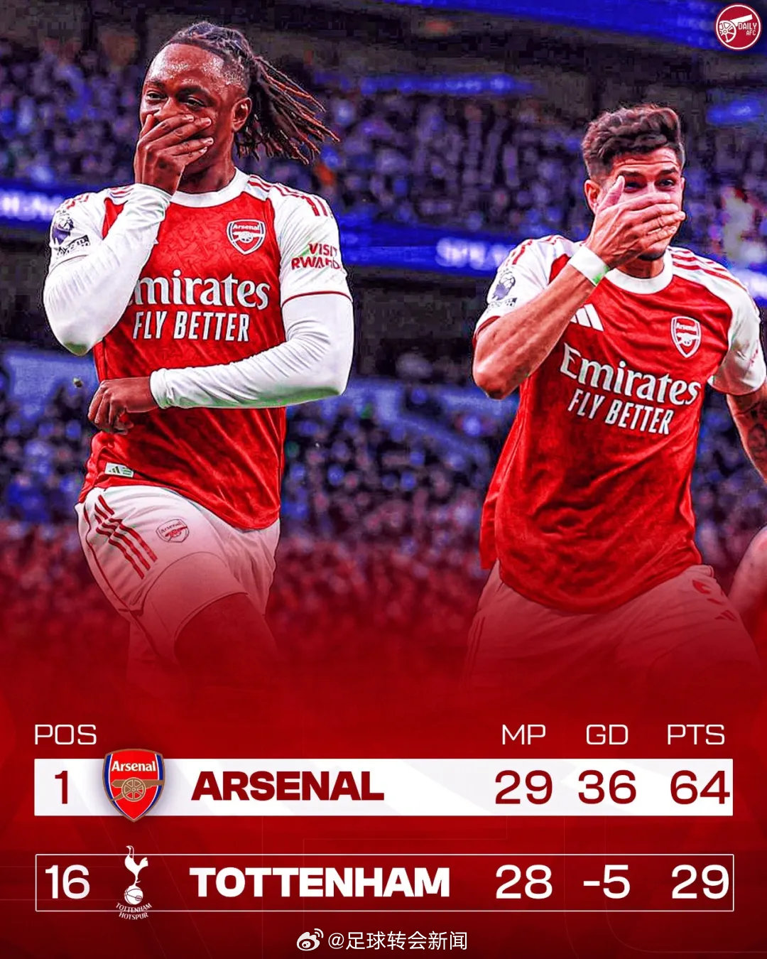 本场胜利之后,阿森纳在数学上已经确保本赛季积分高于热刺,连续4个赛季迎来圣托特纳姆日!