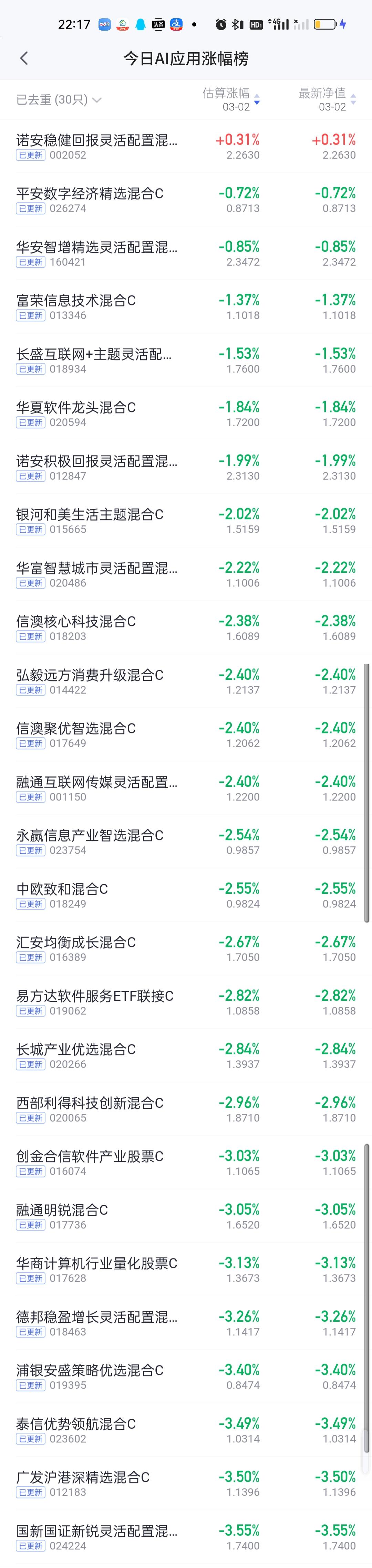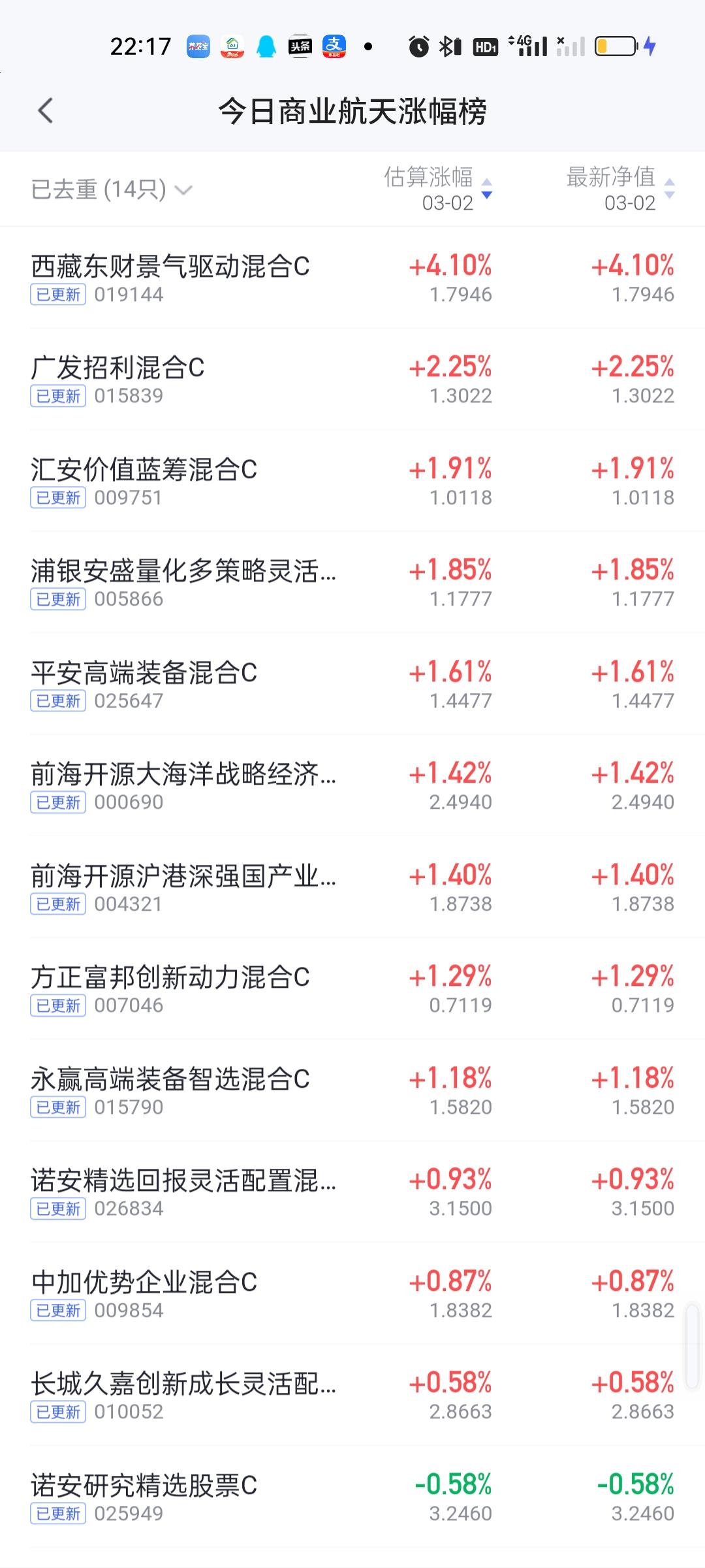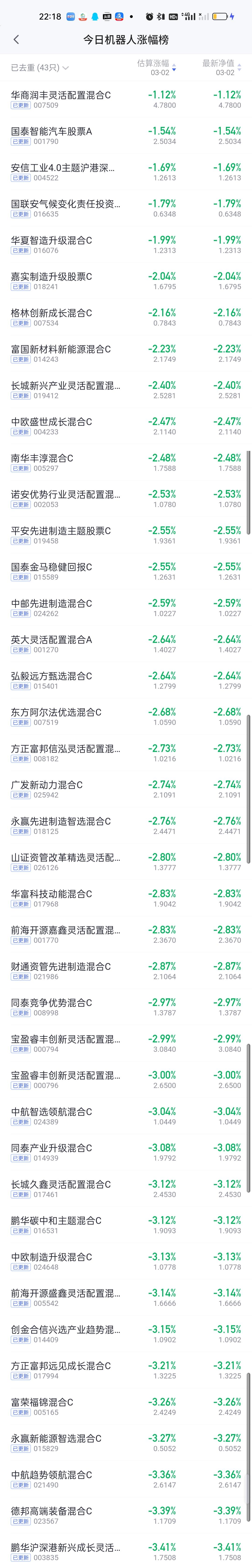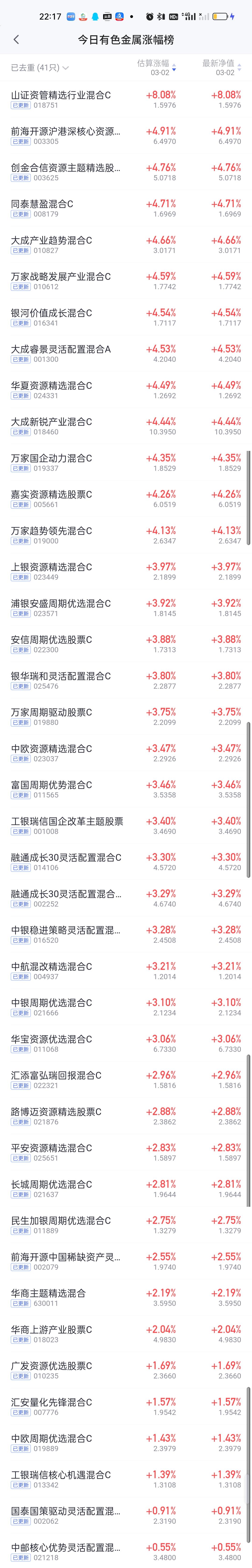 今日基金净值榜已全部更新完毕。西部利得三兄弟排名前三。华富永鑫,前海开源金银珠宝,汇添富中证油气资源,山证资管精选行业,万家周期视野股票分列3--8位,收益率都在8%以上。 跌幅榜方面,西藏东财卓越成长4.65%排名第一,西部利得绿色能源4.52%排名第二,广发价值领先4.16%排名第三,鹏华创新能力4.13%排名第四,申万菱信数字产业股票4.09%排名第五。 有色金属,商业航天,AI应用,CPO,机器人,创新药涨幅榜一并奉上!