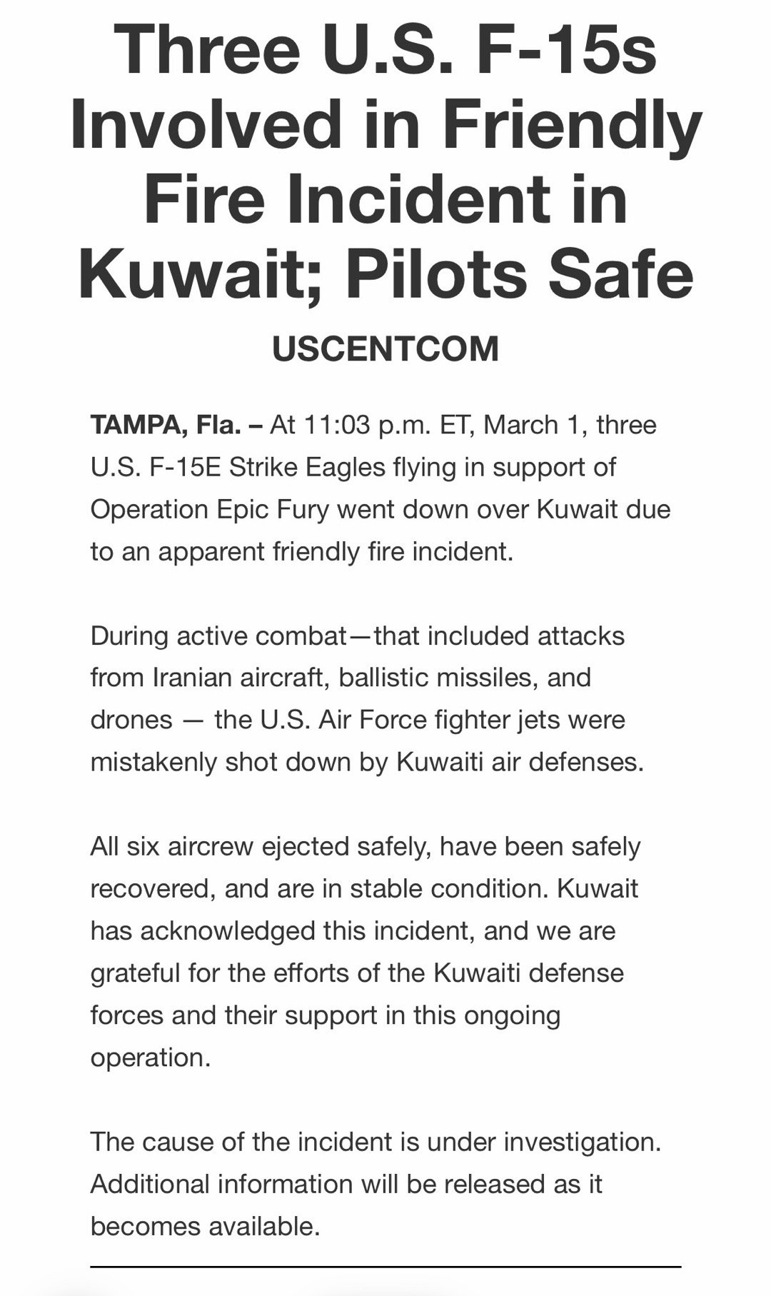 美军声明的详细内容在经历网页崩溃之后重新显示了,明确击落3架F-15E的是科威特本国的爱国者导弹,而不是驻扎的美军