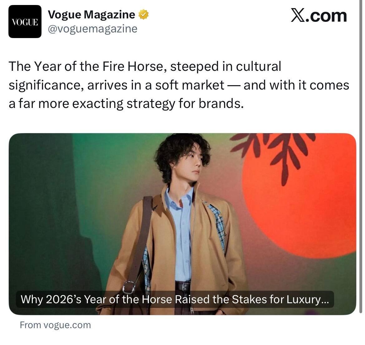 王一博 VOGUE Business 发布了一篇关于王一博与 LOEWE 2026 年中国新年活动的文章:“LOEWE 的中国新年活动之所以脱颖而出,是因为它没有将中国文化视为参考资料,而是将其作为叙事基础设施。王一博的选角是这一翻译的核心。作为中国最具影响力的文艺人物之一,王一博不仅仅是一位明星代言人,而是在青年身份、娱乐和时尚权威的交汇处占据着一个罕见的位置。🔥🔥国际影响力🔥🔥