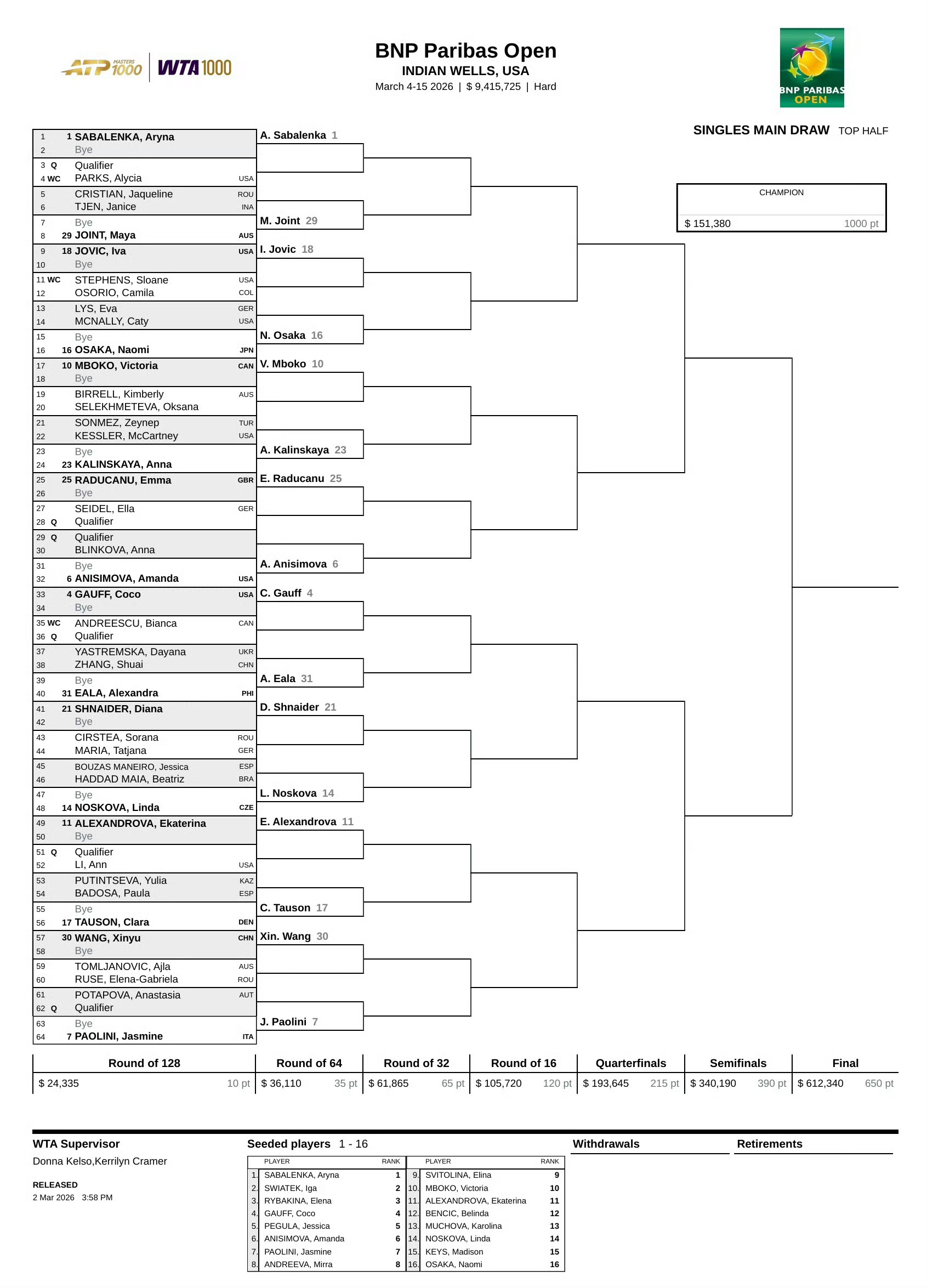 2026赛季WTA印第安维尔斯1000赛女单签表出炉,前八种子对位情况如下: