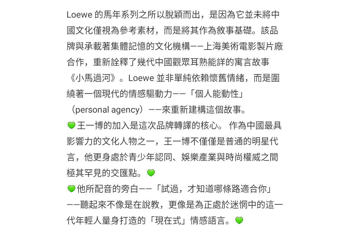 VOGUE 发布关于 LOEWE 2026 年中国新年营销活动脱颖而出的文章。VOGUE总是说得很精准: 王一博的加入是这次品牌转译的核心💚,作为中国最具影响力的文化人物之一,王一博不仅仅是普通明星代言,他更身处于青少年认同、娱乐产业与时尚权威之间极其罕见的交汇处。 国外媒体对于王一博都是不吝赞美的。[赞]
