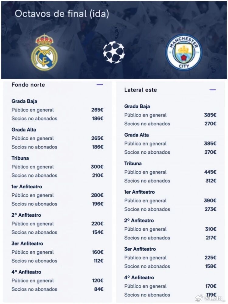 皇马公布欧冠1/8决赛首回合票价:价格从84欧元至445欧元不等▼欧冠皇马