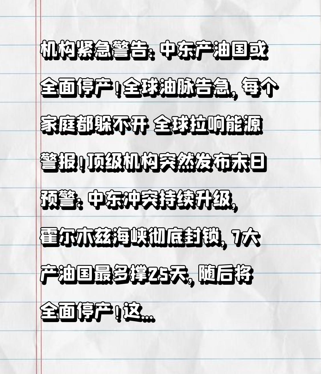 机构紧急警告:中东产油国或全面停产!全球油脉告急,每个家庭都躲不开 全球拉响能源警报!顶级机构突然发布末日预警:中东冲突持续升级,霍尔木兹海峡彻底封锁,7大产油国最多撑25天,随后将全面停产!这不是电影剧情,是正在逼近的现实,看完你就知道,这事和你我息息相关! 这条仅33公里宽的海峡,承载全球1/3石油、1/5天然气运输,是名副其实的世界油脉。如今航运近乎停摆,油轮不敢出海、保险全面叫停,沙特最大炼油厂已关闭,卡塔尔暂停LNG出口,石油运不出去,储油罐很快就会装满。 摩根大通测算:陆上储油仅够22天,加上海上油轮缓冲,最多再撑3-4天,满打满算25天,一旦超限,油田必须关井,全球能源供应直接被掐断喉咙。油价已单日暴涨13%,机构预测,若持续封锁,油价将冲至100-120美元/桶,远超1970年代石油禁运危机。 转折来了:很多人觉得石油停产是国家大事,和老百姓没关系。大错特错! 石油是工业血液,油价一涨,汽油涨价、物流涨价、外卖涨价、机票涨价,从开车出行到买菜购物,从塑料日化到衣物纺织,全产业链成本上涨,最终买单的,是我们每一个普通人。 我们总以为战争、封锁、能源危机都很遥远,可如今中东乱局告诉我们:全球化时代,没有真正的远方,一场冲突,就能打乱千万家庭的柴米油盐。 我们不站队、不煽战,只盼战火早日熄灭,航道早日恢复。和平才是最便宜的能源,安稳才是最值钱的财富。 愿世界不再有战乱封锁,能源稳定、物价平稳;更庆幸我们生在和平中国,有充足能源储备与强大兜底保障。珍惜眼前的安稳日子,也愿远方硝烟散尽,人人都能平安生活!