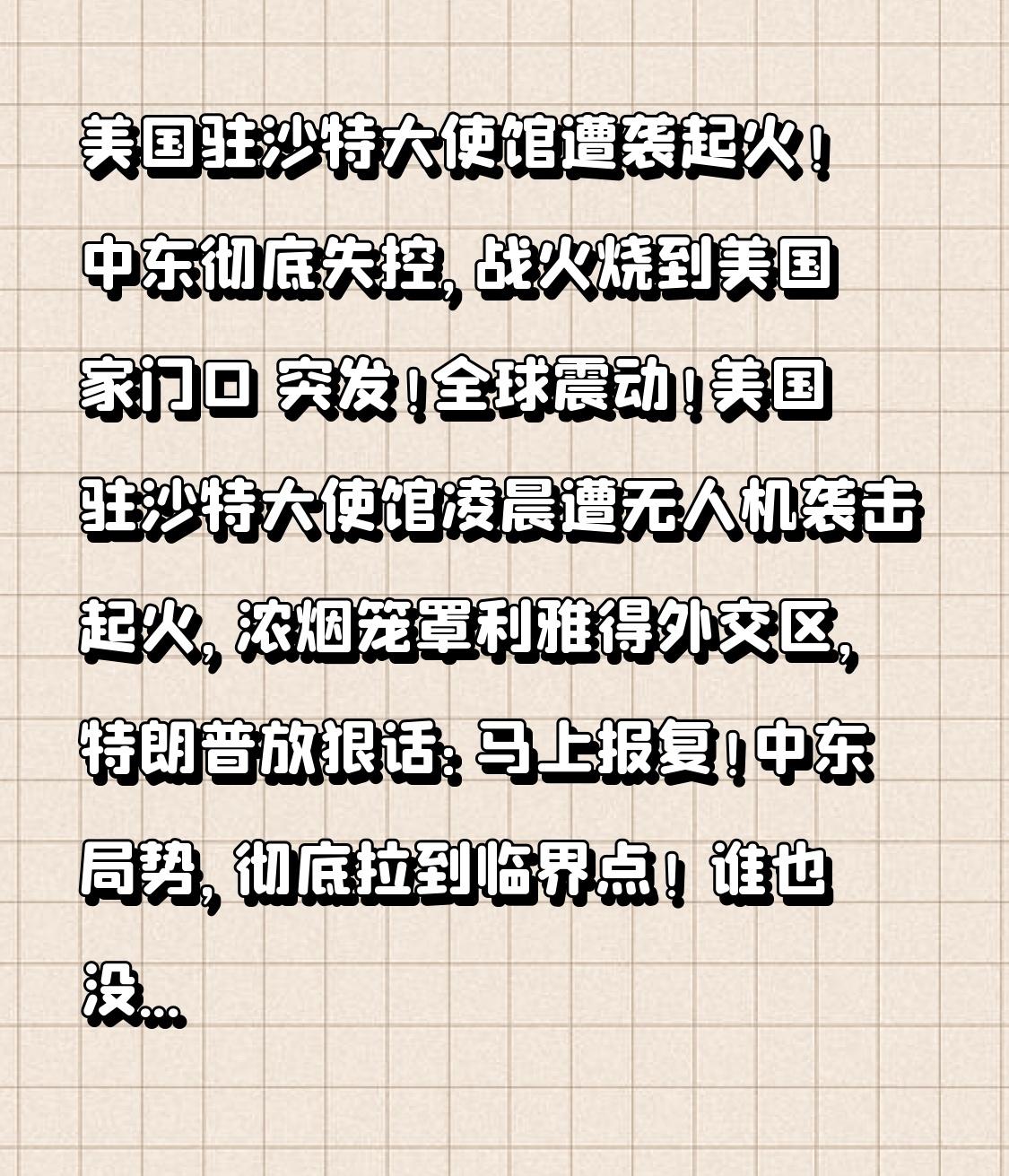 美国驻沙特大使馆遭袭起火!中东彻底失控,战火烧到美国家门口 突发!全球震动!美国驻沙特大使馆凌晨遭无人机袭击起火,浓烟笼罩利雅得外交区,特朗普放狠话:马上报复!中东局势,彻底拉到临界点! 谁也没想到,战火竟然直接烧到了美国最核心的盟友地盘。沙特首都利雅得,一向被视为中东最安全的地区之一,可就在凌晨,两声巨响划破夜空,两架无人机精准命中美国大使馆,建筑瞬间起火,黑烟冲天。 使馆紧急发布就地避难令,利雅得、吉达、达兰全部进入警戒状态,在沙美国公民慌不择路。这已经不是第一次了,前一天美国驻科威特大使馆刚被袭击,现在轮到沙特,美国在中东的外交据点,接连成为打击目标。 转折来了:很多人还觉得这是大国博弈,和普通人没关系。大错特错! 美国大使馆遇袭,意味着战争全面升级、局势彻底失控。霍尔木兹海峡封锁、油价暴涨、物价上涨、全球供应链震荡,远在千里之外的我们,生活成本都会跟着受影响。更可怕的是,战火一旦蔓延,受苦的永远是平民百姓。 美军号称全球最强,防空系统密布中东,可还是拦不住无人机突防。这一幕狠狠戳破真相:再强的军事霸权,也挡不住怒火蔓延;再严密的防御,也护不住四处点火的疯狂。 我们不站队、不煽战,只心疼无辜平民,只渴望战火熄灭。没有谁愿意活在炮火之下,没有国家愿意在动荡中求生。 愿冲突各方保持克制,愿对话取代对抗,愿硝烟早日散去。也提醒所有人:我们生在和平中国,不用担惊受怕,这就是最大的幸福。 珍惜当下平安,愿世界再无战乱,人人皆得安稳!