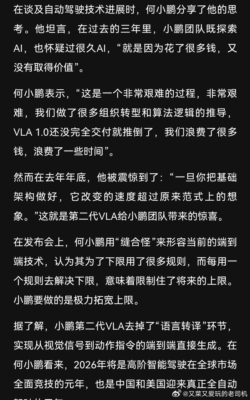 就目前看,小鹏、理想的新一代智驾都进步巨大。其实用小鹏和理想,改用世界模型就用世界模型吧,没必要不承认,普通用户只管智驾好不好用、好用就会买你的车,哪会管你用什么技术线路呢?现在的情况看,华蔚小理都统一在使用世界模型了,世界模型的能力其实才刚刚开始展现、技术平台的红利期才刚刚开始,所以接下去中国智能网联汽车整体的智驾能力都会有一个巨大的提升、用户的出行安全和便利性都将得到极大的提升。可以预见的是:往后几年内,全国长途智驾游会得到迅猛增长、带动旅游等相关产业的增长。