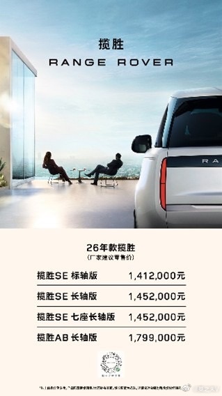 26年款揽胜焕新上市▪ 26年款揽胜焕新升级,车型阵容同步优化,官方指导价141.2万-179.9万元▪ 新车提供SE标轴版、SE长轴版、SE七座长轴版及AB长轴版四款核心车型,选择更清晰、体验更多元▪ 26年款揽胜延续其豪华SUV市场标杆地位,以精致设计、传奇全地形能力与至臻驾乘体验诠释豪华本质