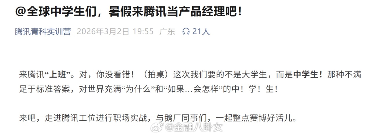 以前在大厂实习的还是大学生、研究生,现在13岁就能进鹅厂做产品经理了,岂不是毕业后就有10年工作经验