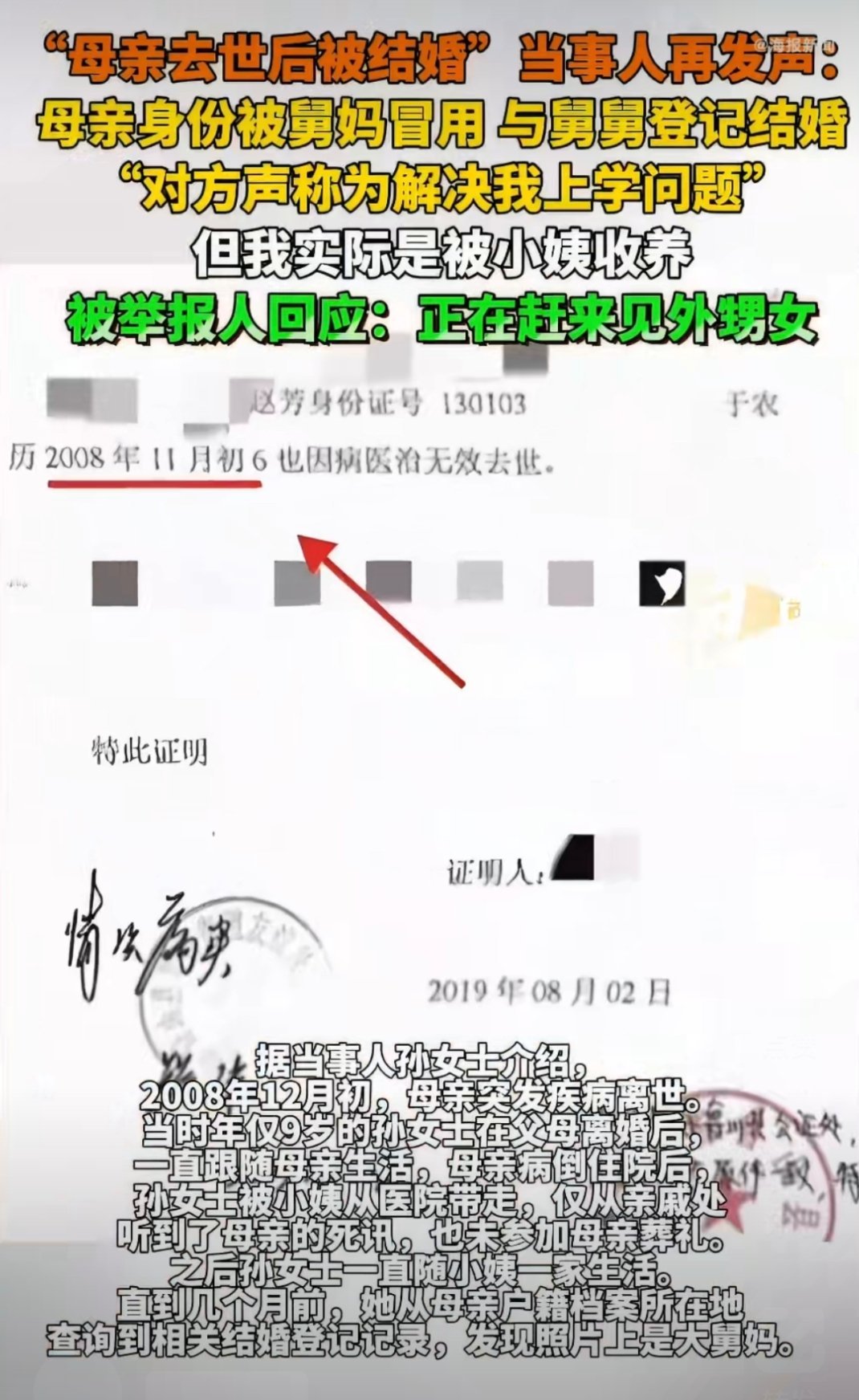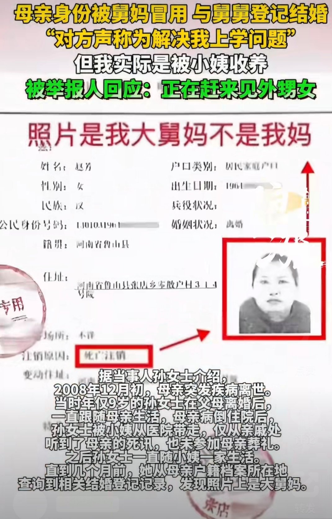 舅妈冒用去世母亲身份与舅舅结婚天啊,太离谱了,母亲去世了没有销户吗?即使没有,他们是亲姐弟,怎么可以登记结婚?还有这样贪心的舅舅!钱是个好东西大家都喜欢,但要取之有道啊!