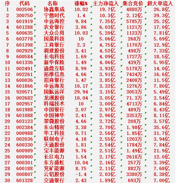 3月3日收盘,主力资金,已经大幅卖出的30名单: 紫金矿业:净流入 -33.9亿元 北方稀土:净流入 -25.0亿元 胜宏科技:净流入 -17.6亿元 兆易创新:净流入 -17.0亿元 华胜天成:净流入 -15.7亿元 澜起科技:净流入 -15.3亿元 天孚通信:净流入 -15.2亿元 信维通信:净流入 -14.6亿元 特变电工:净流入 -14.5亿元 包钢股份:净流入 -14.2亿元 3月3日收盘,主力资金“大幅买入”的30名单: 协鑫集成:净流入 19.7亿元 宁德时代:净流入 10.3亿元 中远海控:净流入 7.35亿元 农业银行:净流入 6.03亿元 大众公用:净流入 5.20亿元 国晟科技:净流入 5.06亿元 工商银行:净流入 4.75亿元 润建股份:净流入 4.52亿元 长电科技:净流入 4.09亿元 新华保险:净流入 4.06亿元 通鼎互联:净流入 3.93亿元 拓维信息:净流入 3.91亿元 招商银行:净流入 3.85亿元 中远海发:净流入 3.32亿元 国航远洋:净流入 3.15亿元 龙洲股份:净流入 3.05亿元 科瑞技术:净流入 3.00亿元 中国银行:净流入 2.97亿元 中国神华:净流入 2.96亿元 翠微股份:净流入 2.72亿元