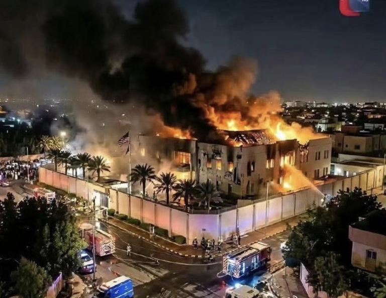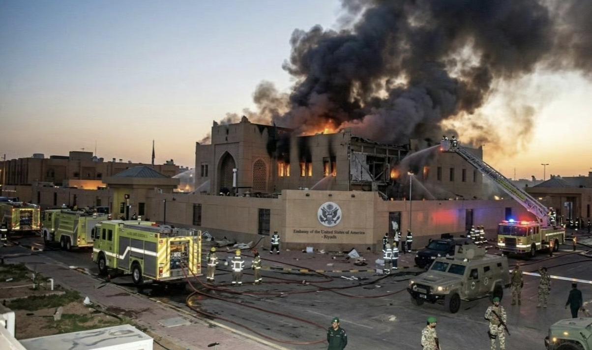 导弹正中M国驻沙特大使馆,完爆,直接废了武功!建筑墙面清晰印有“Embassy of the United States of America - Riyadh”标识及M国国徽。 还说波斯导弹打不准?说打你主体建筑连围墙也不会碰! 事件的政治杀伤力极强。波斯通过精准打击M国在核心盟友沙特境内的使馆,是对鱿撒此前斩首行动的直接羞辱和反击,意在向鱿撒传递“我能打到你核心利益”的强烈信号。它宣告了中东地区已经从局部冲突滑向规则崩塌的全面对抗时代,同时也敲响了M国全球霸权及传统安全体系失效的警钟。